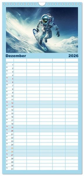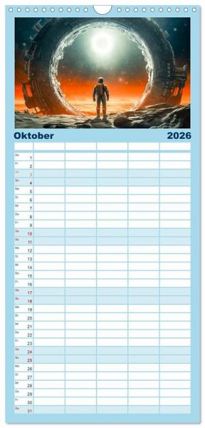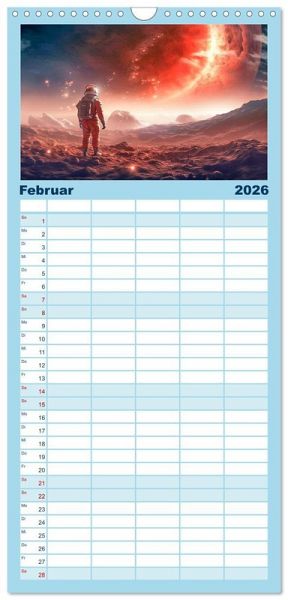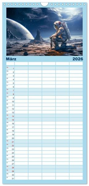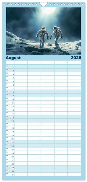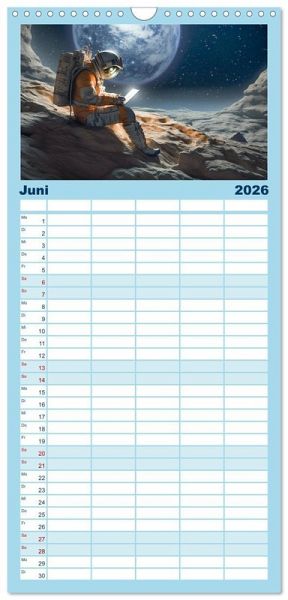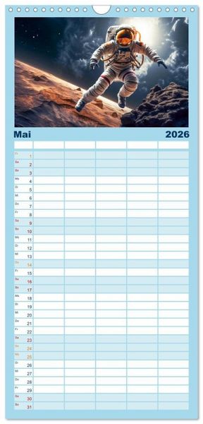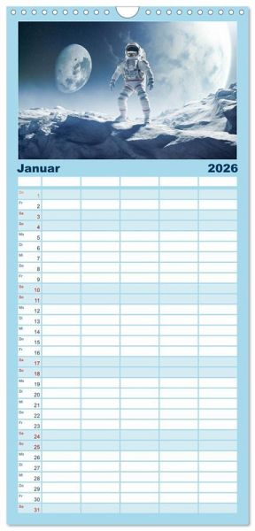 PRAKTISCH - übersichtlicher Familienkalender mit 5 Spalten für bis zu 5 Personen für mehr Struktur im Alltag - so bleiben alle Termine im Blick!ÜBERSICHTLICH - mit farblich getrennten Wochen- und Feiertagen. Die einzelnen Felder bieten genügend Platz für Eintragungen. So macht Organisieren Spaß!FANTASTISCHE BILDER - Dieser Planer ist nicht nur eine nützliche Hilfe im Alltag, sondern schmückt gleichzeitig Ihr Zuhause. Ideal auch als Geschenk.FÜR ALLE STIFTE GEEIGNET - ganz egal, ob Sie lieber mit Kugelschreiber oder Bleistift schreiben.NACHHALTIG - deutliche Abfallreduzierung durch bedarfsgerechte Einzelstückfertigung, umweltfreundliches FSC-zertifiziertes Papier, Produktion in Deutschland, klimabewusste Logistik.Tauche ein in die atemberaubende Welt des Weltraums und lass dich von beeindruckenden Astronautenillustrationen inspirieren. von Autor(in): Dirk Meutzner