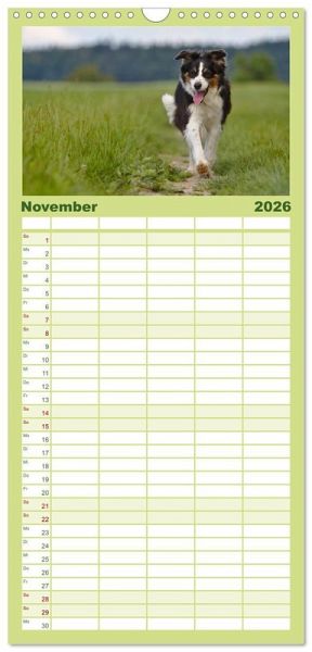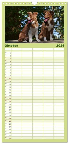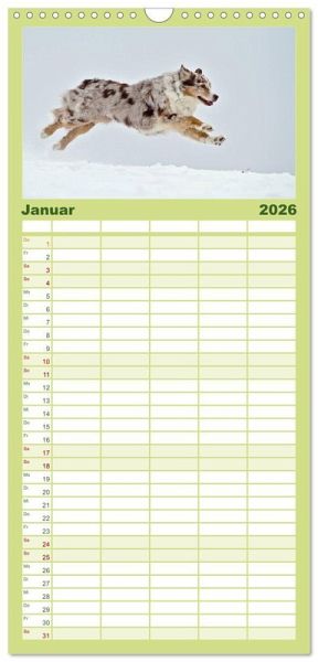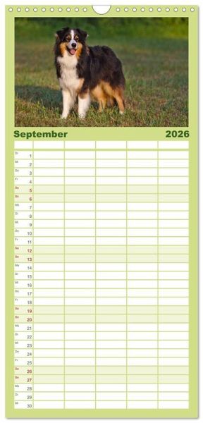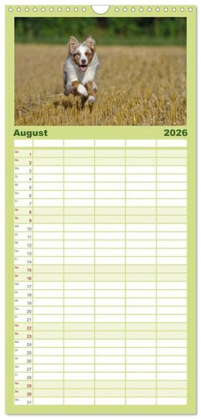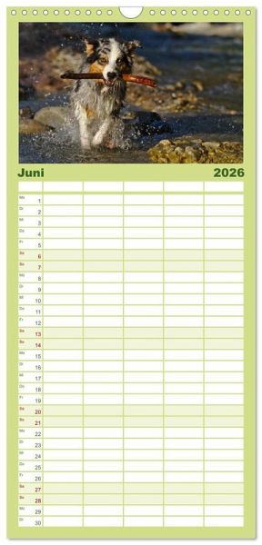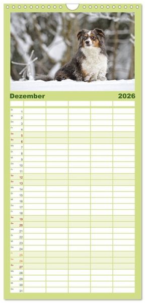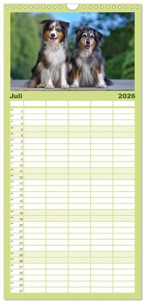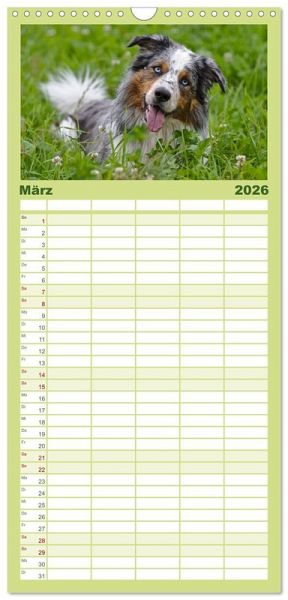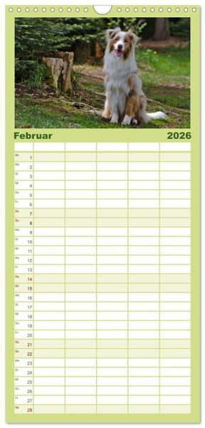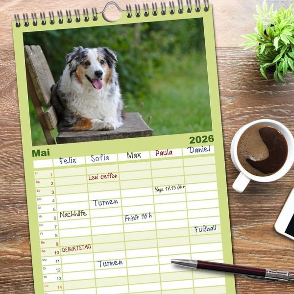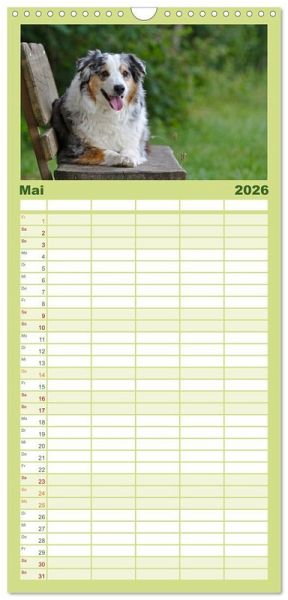 PRAKTISCH - übersichtlicher Familienkalender mit 5 Spalten für bis zu 5 Personen für mehr Struktur im Alltag - so bleiben alle Termine im Blick!ÜBERSICHTLICH - mit farblich getrennten Wochen- und Feiertagen. Die einzelnen Felder bieten genügend Platz für Eintragungen. So macht Organisieren Spaß!FANTASTISCHE BILDER - Dieser Planer ist nicht nur eine nützliche Hilfe im Alltag, sondern schmückt gleichzeitig Ihr Zuhause. Ideal auch als Geschenk.FÜR ALLE STIFTE GEEIGNET - ganz egal, ob Sie lieber mit Kugelschreiber oder Bleistift schreiben.NACHHALTIG - deutliche Abfallreduzierung durch bedarfsgerechte Einzelstückfertigung, umweltfreundliches FSC-zertifiziertes Papier, Produktion in Deutschland, klimabewusste Logistik.Faszination Australian Shepherd - Berührende Augenblicke begleiten Sie durchs ganze Jahr von Autor(in): David Andrey