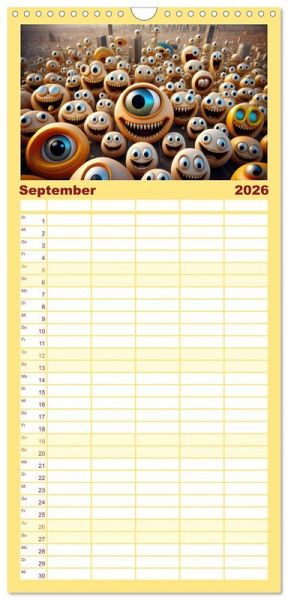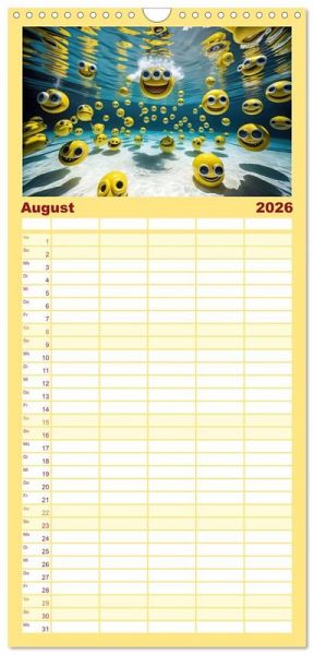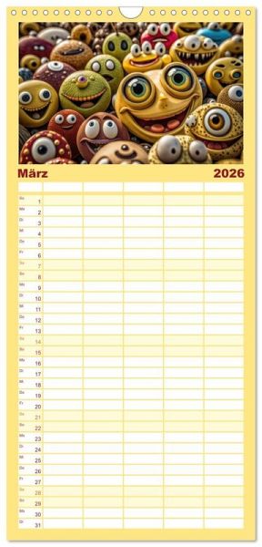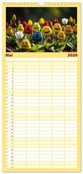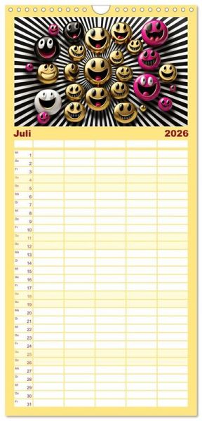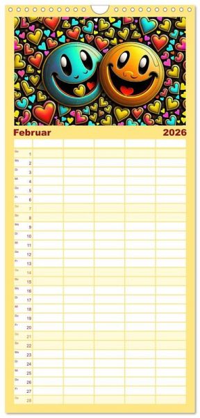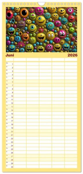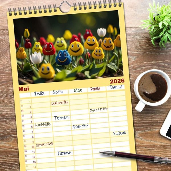 - übersichtlicher Familienkalender mit 5 Spalten für bis zu 5 Personen für mehr Struktur im Alltag - so bleiben alle Termine im Blick!ÜBERSICHTLICH - mit farblich getrennten Wochen- und Feiertagen. Die einzelnen Felder bieten genügend Platz für Eintragungen. So macht Organisieren Spaß!FANTASTISCHE BILDER - Dieser Planer ist nicht nur eine nützliche Hilfe im Alltag, sondern schmückt gleichzeitig Ihr Zuhause. Ideal auch als Geschenk.FÜR ALLE STIFTE GEEIGNET - ganz egal, ob Sie lieber mit Kugelschreiber oder Bleistift schreiben.NACHHALTIG - deutliche Abfallreduzierung durch bedarfsgerechte Einzelstückfertigung, umweltfreundliches FSC-zertifiziertes Papier, Produktion in Deutschland, klimabewusste Logistik.Smilies, mit KI generiert und in PhotoImpact bearbeitet. von Autor(in): Cloudflyer0123