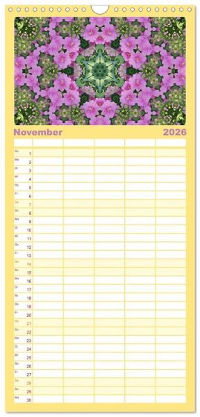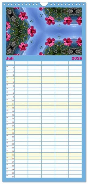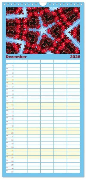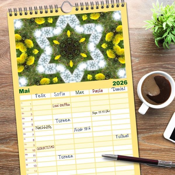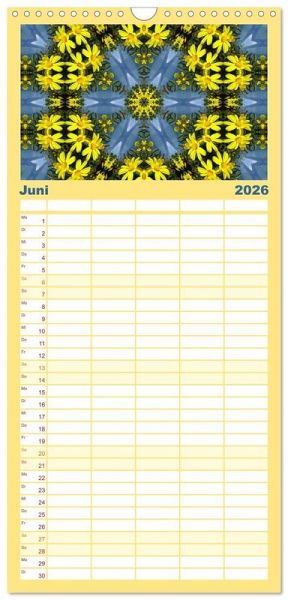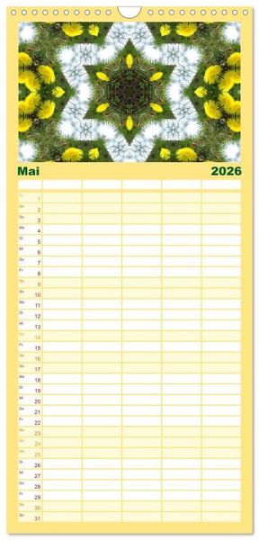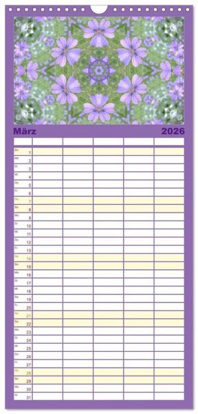 PRAKTISCH - übersichtlicher Familienkalender mit 5 Spalten für bis zu 5 Personen für mehr Struktur im Alltag - so bleiben alle Termine im Blick!ÜBERSICHTLICH - mit farblich getrennten Wochen- und Feiertagen. Die einzelnen Felder bieten genügend Platz für Eintragungen. So macht Organisieren Spaß!FANTASTISCHE BILDER - Dieser Planer ist nicht nur eine nützliche Hilfe im Alltag, sondern schmückt gleichzeitig Ihr Zuhause. Ideal auch als Geschenk.FÜR ALLE STIFTE GEEIGNET - ganz egal, ob Sie lieber mit Kugelschreiber oder Bleistift schreiben.NACHHALTIG - deutliche Abfallreduzierung durch bedarfsgerechte Einzelstückfertigung, umweltfreundliches FSC-zertifiziertes Papier, Produktion in Deutschland, klimabewusste Logistik.Blüten im Kaleidoskop gespiegelt dargestellt von Autor(in): Sabine Hampe-Neves