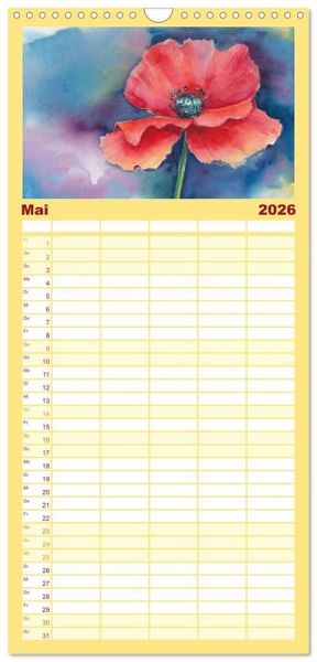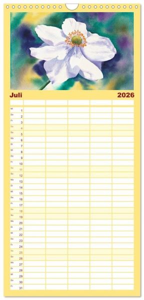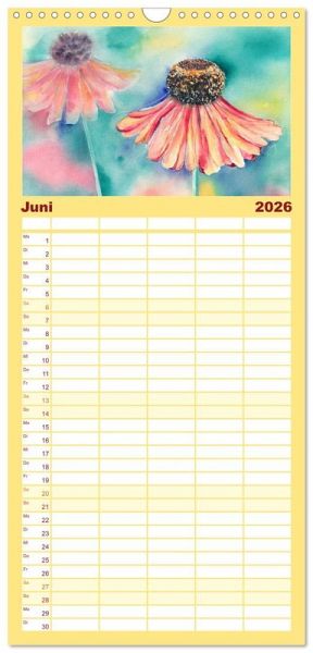 PRAKTISCH - übersichtlicher Familienkalender mit 5 Spalten für bis zu 5 Personen für mehr Struktur im Alltag - so bleiben alle Termine im Blick!ÜBERSICHTLICH - mit farblich getrennten Wochen- und Feiertagen. Die einzelnen Felder bieten genügend Platz für Eintragungen. So macht Organisieren Spaß!FANTASTISCHE BILDER - Dieser Planer ist nicht nur eine nützliche Hilfe im Alltag, sondern schmückt gleichzeitig Ihr Zuhause. Ideal auch als Geschenk.FÜR ALLE STIFTE GEEIGNET - ganz egal, ob Sie lieber mit Kugelschreiber oder Bleistift schreiben.NACHHALTIG - deutliche Abfallreduzierung durch bedarfsgerechte Einzelstückfertigung, umweltfreundliches FSC-zertifiziertes Papier, Produktion in Deutschland, klimabewusste Logistik.Handgemalte Aquarelle von Blumenmotiven aus der Nähe von Autor(in): Jitka Krause