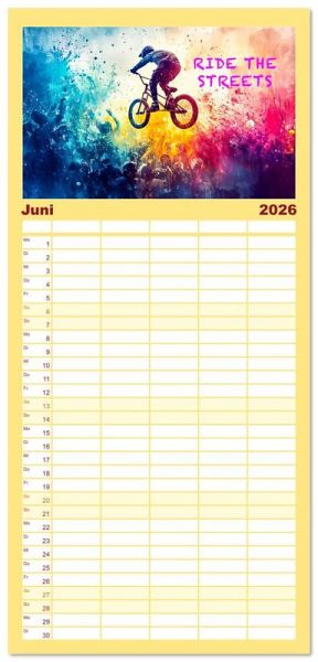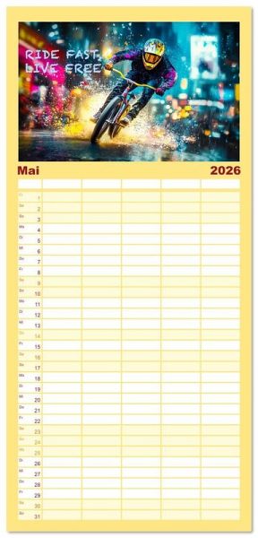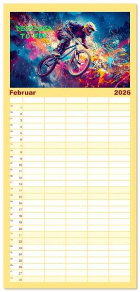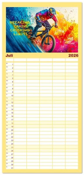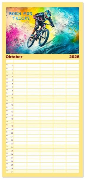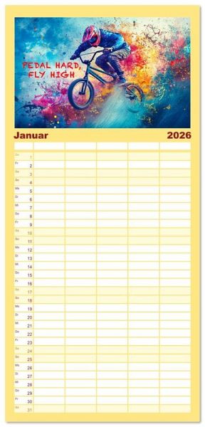 PRAKTISCH - übersichtlicher Familienkalender mit 5 Spalten für bis zu 5 Personen für mehr Struktur im Alltag - so bleiben alle Termine im Blick!ÜBERSICHTLICH - mit farblich getrennten Wochen- und Feiertagen. Die einzelnen Felder bieten genügend Platz für Eintragungen. So macht Organisieren Spaß!FANTASTISCHE BILDER - Dieser Planer ist nicht nur eine nützliche Hilfe im Alltag, sondern schmückt gleichzeitig Ihr Zuhause. Ideal auch als Geschenk.FÜR ALLE STIFTE GEEIGNET - ganz egal, ob Sie lieber mit Kugelschreiber oder Bleistift schreiben.NACHHALTIG - deutliche Abfallreduzierung durch bedarfsgerechte Einzelstückfertigung, umweltfreundliches FSC-zertifiziertes Papier, Produktion in Deutschland, klimabewusste Logistik.Zwölf Monate pure Action, coole Slogans und inspirierende Tricks für dein Jahr! von Autor(in): Dirk Meutzner