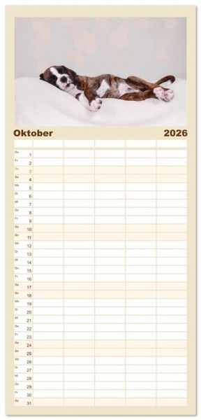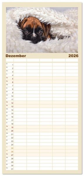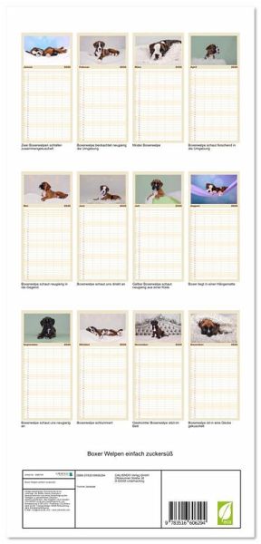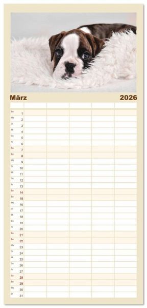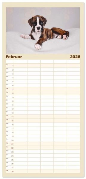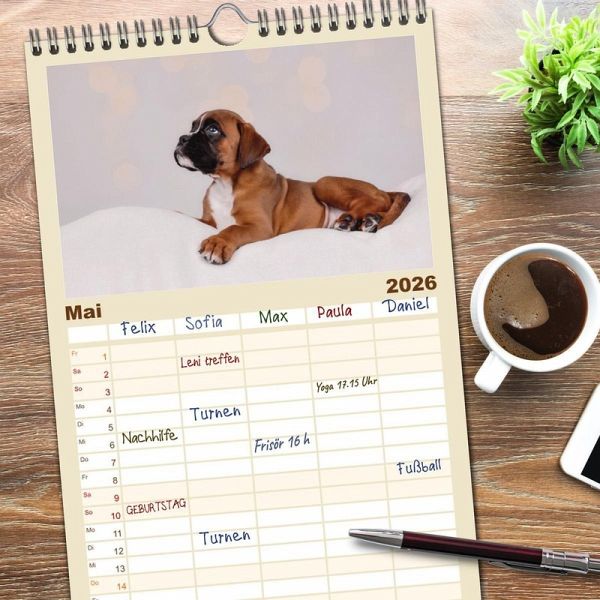 PRAKTISCH - übersichtlicher Familienkalender mit 5 Spalten für bis zu 5 Personen für mehr Struktur im Alltag - so bleiben alle Termine im Blick!ÜBERSICHTLICH - mit farblich getrennten Wochen- und Feiertagen. Die einzelnen Felder bieten genügend Platz für Eintragungen. So macht Organisieren Spaß!FANTASTISCHE BILDER - Dieser Planer ist nicht nur eine nützliche Hilfe im Alltag, sondern schmückt gleichzeitig Ihr Zuhause. Ideal auch als Geschenk.FÜR ALLE STIFTE GEEIGNET - ganz egal, ob Sie lieber mit Kugelschreiber oder Bleistift schreiben.NACHHALTIG - deutliche Abfallreduzierung durch bedarfsgerechte Einzelstückfertigung, umweltfreundliches FSC-zertifiziertes Papier, Produktion in Deutschland, klimabewusste Logistik.Lass dich von den süßesten Boxerwelpen verzaubern, die mit ihrem Charme und ihrer Verspieltheit dein Herz erobern. von Autor(in): Yvonne Janetzek