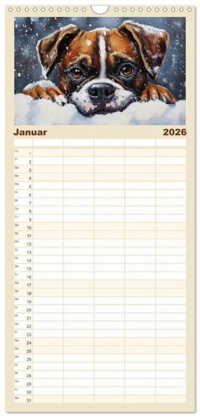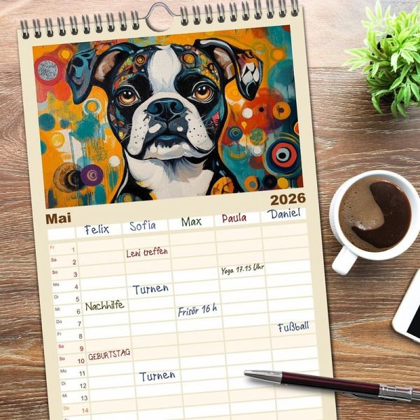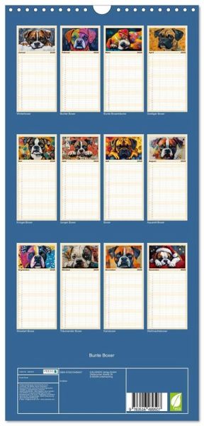 PRAKTISCH - übersichtlicher Familienkalender mit 5 Spalten für bis zu 5 Personen für mehr Struktur im Alltag - so bleiben alle Termine im Blick!ÜBERSICHTLICH - mit farblich getrennten Wochen- und Feiertagen. Die einzelnen Felder bieten genügend Platz für Eintragungen. So macht Organisieren Spaß!FANTASTISCHE BILDER - Dieser Planer ist nicht nur eine nützliche Hilfe im Alltag, sondern schmückt gleichzeitig Ihr Zuhause. Ideal auch als Geschenk.FÜR ALLE STIFTE GEEIGNET - ganz egal, ob Sie lieber mit Kugelschreiber oder Bleistift schreiben.NACHHALTIG - deutliche Abfallreduzierung durch bedarfsgerechte Einzelstückfertigung, umweltfreundliches FSC-zertifiziertes Papier, Produktion in Deutschland, klimabewusste Logistik.Farbenfrohe Boxer-Portraits von Autor(in): Sabine Löwer