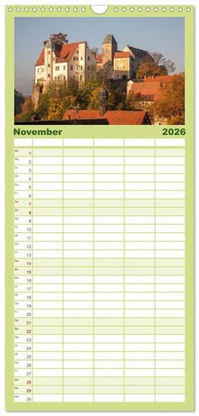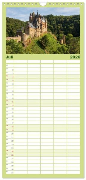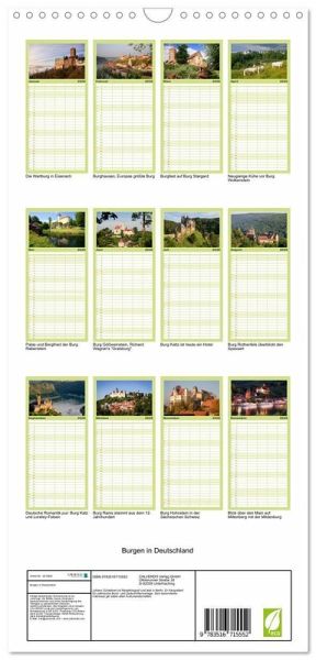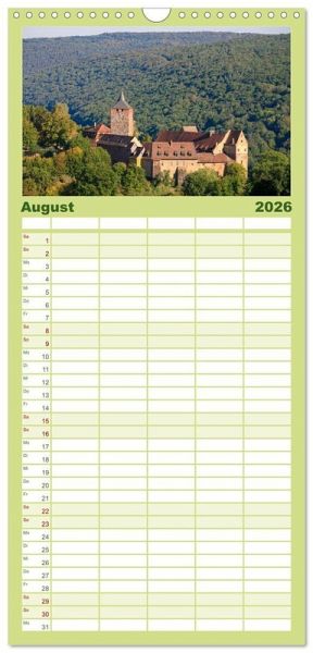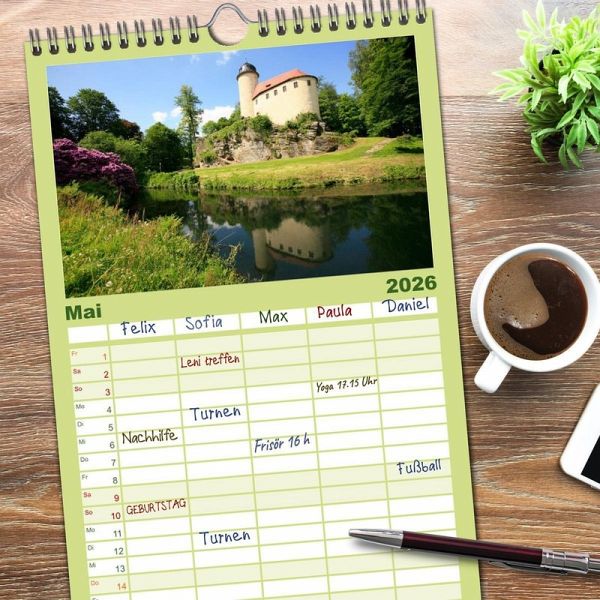 PRAKTISCH - übersichtlicher Familienkalender mit 5 Spalten für bis zu 5 Personen für mehr Struktur im Alltag - so bleiben alle Termine im Blick!ÜBERSICHTLICH - mit farblich getrennten Wochen- und Feiertagen. Die einzelnen Felder bieten genügend Platz für Eintragungen. So macht Organisieren Spaß!FANTASTISCHEBILDER - Dieser Planer ist nicht nur eine nützliche Hilfe im Alltag, sondern schmückt gleichzeitig Ihr Zuhause. Ideal auch als Geschenk.FÜR ALLE STIFTE GEEIGNET - ganz egal, ob Sie lieber mit Kugelschreiber oder Bleistift schreiben.NACHHALTIG - deutliche Abfallreduzierung durch bedarfsgerechte Einzelstückfertigung, umweltfreundliches FSC-zertifiziertes Papier, Produktion in Deutschland, klimabewusste Logistik.Der Berliner Reisefotograf Johann Scheibner stellt einige romantische, mittelalterliche Burgen vor. von Autor(in): Johann Scheibner