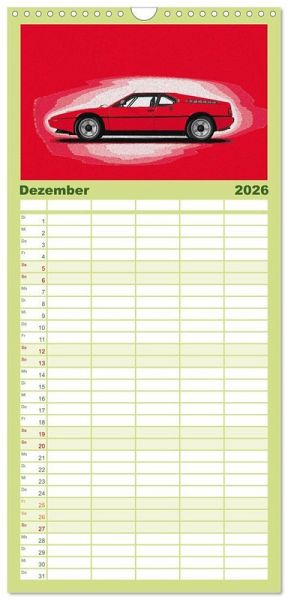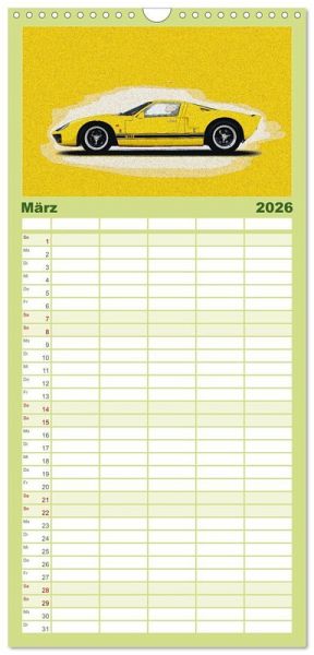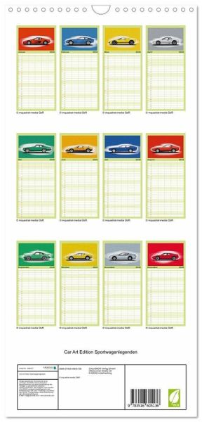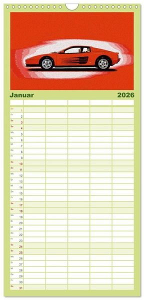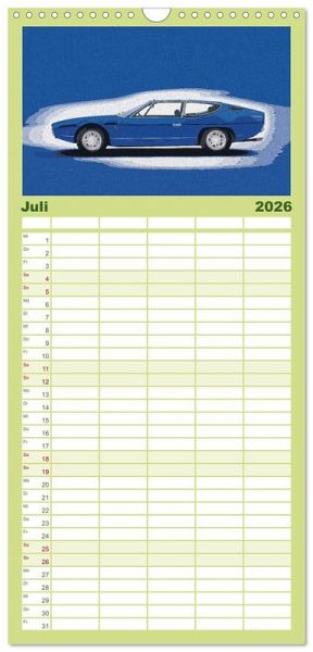 PRAKTISCH - übersichtlicher Familienkalender mit 5 Spalten für bis zu 5 Personen für mehr Struktur im Alltag - so bleiben alle Termine im Blick!ÜBERSICHTLICH - mit farblich getrennten Wochen- und Feiertagen. Die einzelnen Felder bieten genügend Platz für Eintragungen. So macht Organisieren Spaß!FANTASTISCHE BILDER - Dieser Planer ist nicht nur eine nützliche Hilfe im Alltag, sondern schmückt gleichzeitig Ihr Zuhause. Ideal auch als Geschenk.FÜR ALLE STIFTE GEEIGNET - ganz egal, ob Sie lieber mit Kugelschreiber oder Bleistift schreiben.NACHHALTIG - deutliche Abfallreduzierung durch bedarfsgerechte Einzelstückfertigung, umweltfreundliches FSC-zertifiziertes Papier, Produktion in Deutschland, klimabewusste Logistik.in Photoshop verfremdete Sportwagen der 70er und 80er Jahre von Autor(in): mquadrat media