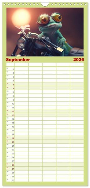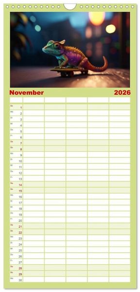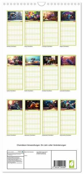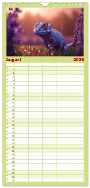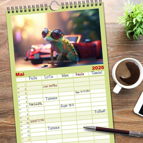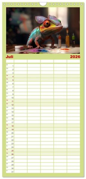 PRAKTISCH - übersichtlicher Familienkalender mit 5 Spalten für bis zu 5 Personen für mehr Struktur im Alltag - so bleiben alle Termine im Blick!ÜBERSICHTLICH - mit farblich getrennten Wochen- und Feiertagen. Die einzelnen Felder bieten genügend Platz für Eintragungen. So macht Organisieren Spaß!FANTASTISCHE BILDER - Dieser Planer ist nicht nur eine nützliche Hilfe im Alltag, sondern schmückt gleichzeitig Ihr Zuhause. Ideal auch als Geschenk.FÜR ALLE STIFTE GEEIGNET - ganz egal, ob Sie lieber mit Kugelschreiber oder Bleistift schreiben.NACHHALTIG - deutliche Abfallreduzierung durch bedarfsgerechte Einzelstückfertigung, umweltfreundliches FSC-zertifiziertes Papier, Produktion in Deutschland, klimabewusste Logistik.Entdecken Sie die farbenfrohe Welt der Chamäleons in diesem einzigartigen Kalender. Jeder Monat präsentiert eine neue Illustration, die diese faszinierenden Tiere in Aktion zeigt. von Autor(in): Michael Kuelbel