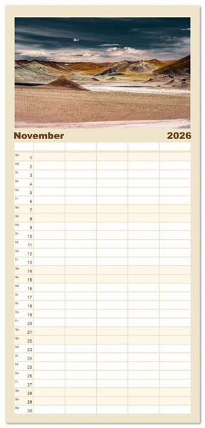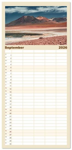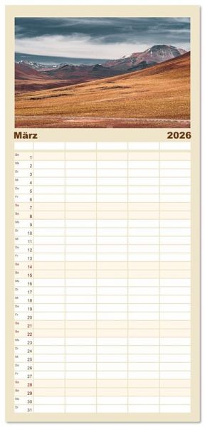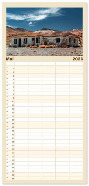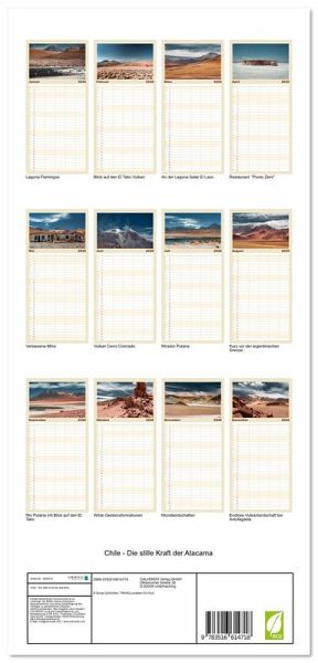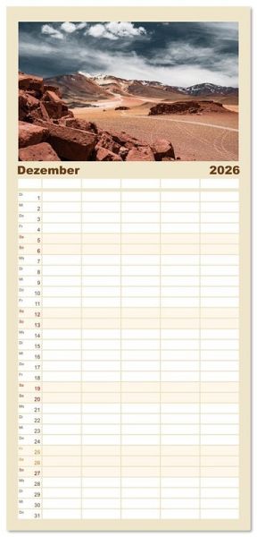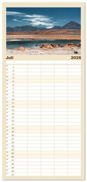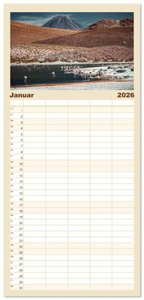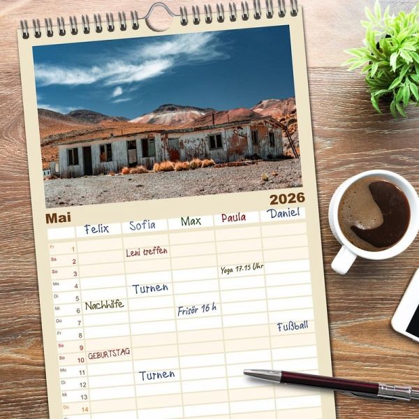 PRAKTISCH - übersichtlicher Familienkalender mit 5 Spalten für bis zu 5 Personen für mehr Struktur im Alltag - so bleiben alle Termine im Blick!ÜBERSICHTLICH - mit farblich getrennten Wochen- und Feiertagen. Die einzelnen Felder bieten genügend Platz für Eintragungen. So macht Organisieren Spaß!FANTASTISCHE BILDER - Dieser Planer ist nicht nur eine nützliche Hilfe im Alltag, sondern schmückt gleichzeitig Ihr Zuhause. Ideal auch als Geschenk.FÜR ALLE STIFTE GEEIGNET - ganz egal, ob Sie lieber mit Kugelschreiber oder Bleistift schreiben.NACHHALTIG - deutliche Abfallreduzierung durch bedarfsgerechte Einzelstückfertigung, umweltfreundliches FSC-zertifiziertes Papier, Produktion in Deutschland, klimabewusste Logistik.Inspirierende Momente aus der Stille: Die Atacama-Wüste im Fokus von Autor(in): Sonja Schlichter