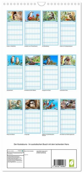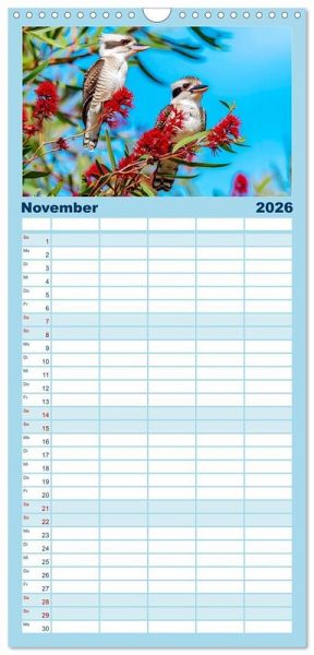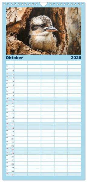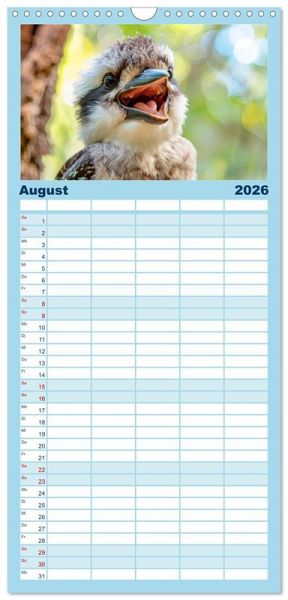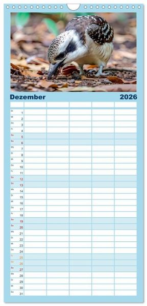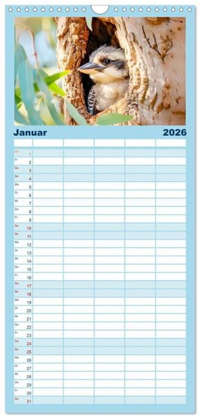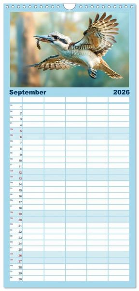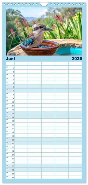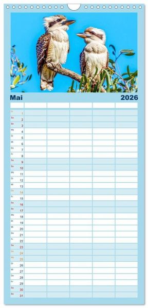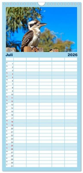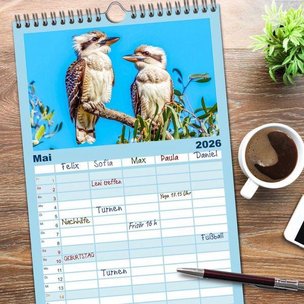 PRAKTISCH - übersichtlicher Familienkalender mit 5 Spalten für bis zu 5 Personen für mehr Struktur im Alltag - so bleiben alle Termine im Blick!ÜBERSICHTLICH - mit farblich getrennten Wochen- und Feiertagen. Die einzelnen Felder bieten genügend Platz für Eintragungen. So macht Organisieren Spaß!FANTASTISCHE BILDER - Dieser Planer ist nicht nur eine nützliche Hilfe im Alltag, sondern schmückt gleichzeitig Ihr Zuhause. Ideal auch als Geschenk.FÜR ALLE STIFTE GEEIGNET - ganz egal, ob Sie lieber mit Kugelschreiber oder Bleistift schreiben.NACHHALTIG - deutliche Abfallreduzierung durch bedarfsgerechte Einzelstückfertigung, umweltfreundliches FSC-zertifiziertes Papier, Produktion in Deutschland, klimabewusste Logistik.KI-generierte Einblicke in das Kookaburra-Leben im Outback von Autor(in): Anja Frost