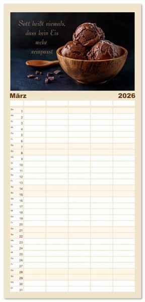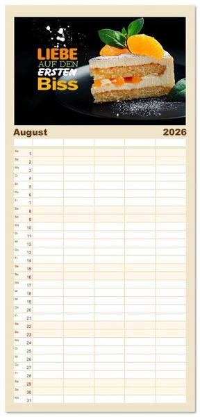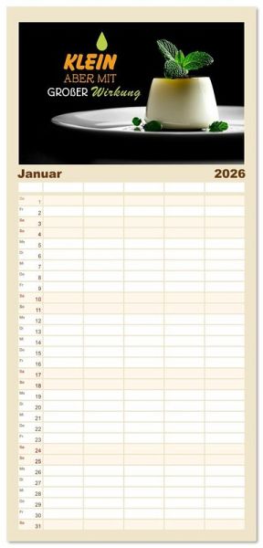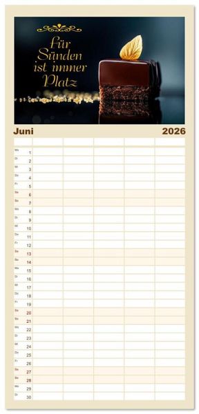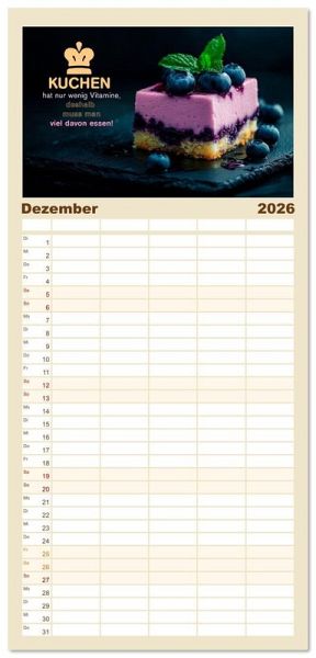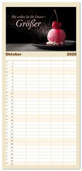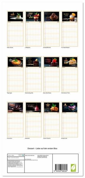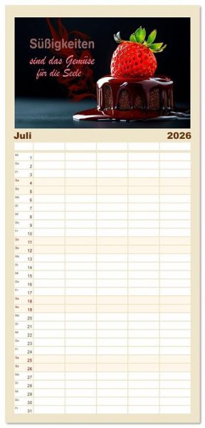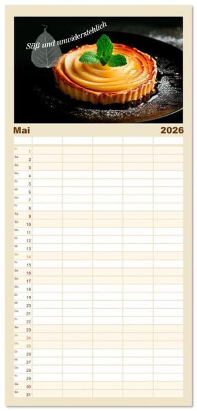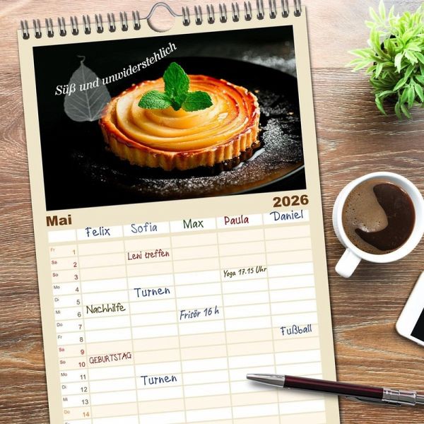 TISCH - übersichtlicher Familienkalender mit 5 Spalten für bis zu 5 Personen für mehr Struktur im Alltag - so bleiben alle Termine im Blick!ÜBERSICHTLICH - mit farblich getrennten Wochen- und Feiertagen. Die einzelnen Felder bieten genügend Platz für Eintragungen. So macht Organisieren Spaß!FANTASTISCHE BILDER - Dieser Planer ist nicht nur eine nützliche Hilfe im Alltag, sondern schmückt gleichzeitig Ihr Zuhause. Ideal auch als Geschenk.FÜR ALLE STIFTE GEEIGNET - ganz egal, ob Sie lieber mit Kugelschreiber oder Bleistift schreiben.NACHHALTIG - deutliche Abfallreduzierung durch bedarfsgerechte Einzelstückfertigung, umweltfreundliches FSC-zertifiziertes Papier, Produktion in Deutschland, klimabewusste Logistik.Verführerische Desserts, kunstvoll angerichtet und fein veredelt von Autor(in): Marion G. Krätschmer