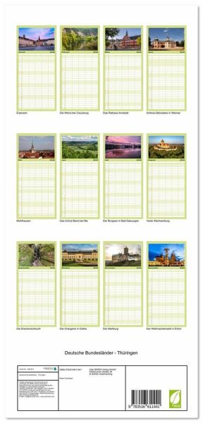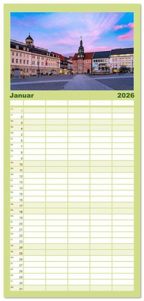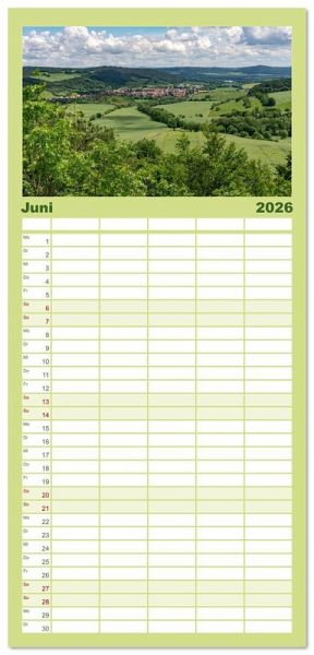 PRAKTISCH - übersichtlicher Familienkalender mit 5 Spalten für bis zu 5 Personen für mehr Struktur im Alltag - so bleiben alle Termine im Blick!ÜBERSICHTLICH - mit farblich getrennten Wochen- und Feiertagen. Die einzelnen Felder bieten genügend Platz für Eintragungen. So macht Organisieren Spaß!FANTASTISCHE BILDER - Dieser Planer ist nicht nur eine nützliche Hilfe im Alltag, sondern schmückt gleichzeitig Ihr Zuhause. Ideal auch als Geschenk.FÜR ALLE STIFTE GEEIGNET - ganz egal, ob Sie lieber mit Kugelschreiber oder Bleistift schreiben.NACHHALTIG - deutliche Abfallreduzierung durch bedarfsgerechte Einzelstückfertigung, umweltfreundliches FSC-zertifiziertes Papier, Produktion in Deutschland, klimabewusste Logistik.12 Monate mit einigen der schönsten Höhepunkte im sehenswerten Bundesland Thüringen. von Autor(in): PeterSchickert