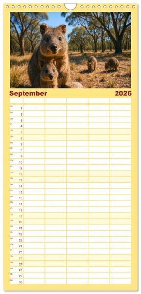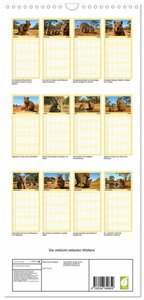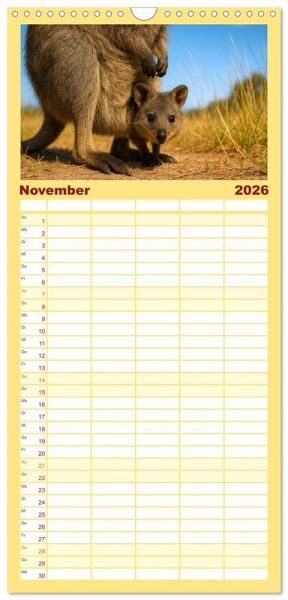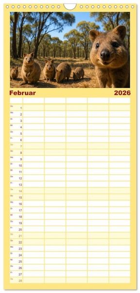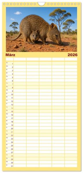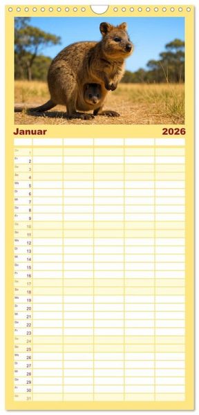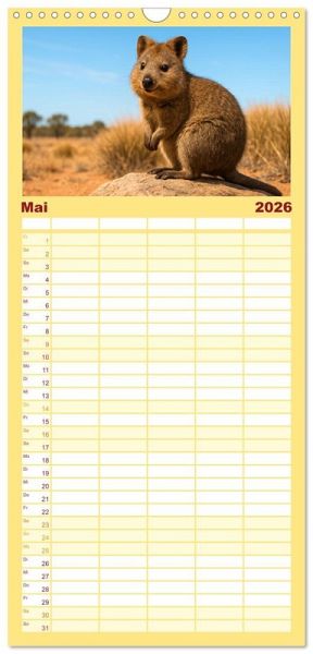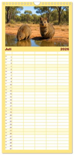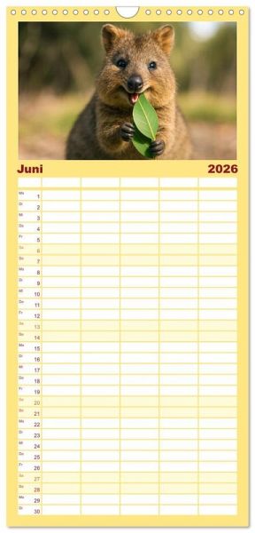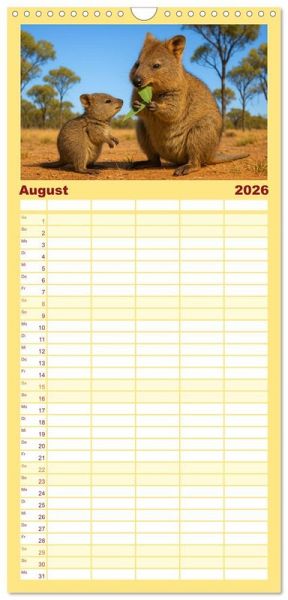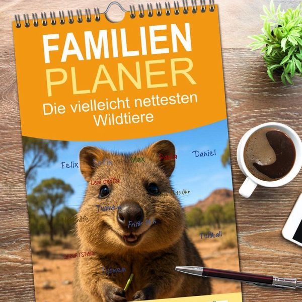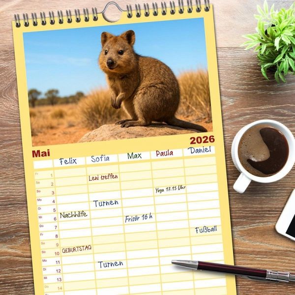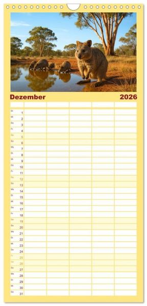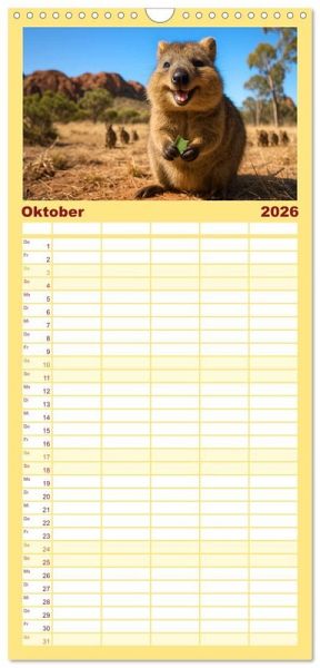PRAKTISCH - übersichtlicher Familienkalender mit 5 Spalten für bis zu 5 Personen für mehr Struktur im Alltag - so bleiben alle Termine im Blick!ÜBERSICHTLICH - mit farblich getrennten Wochen- und Feiertagen. Die einzelnen Felder bieten genügend Platz für Eintragungen. So macht Organisieren Spaß!FANTASTISCHE BILDER - Dieser Planer ist nicht nur eine nützliche Hilfe im Alltag, sondern schmückt gleichzeitig Ihr Zuhause. Ideal auch als Geschenk.FÜR ALLE STIFTE GEEIGNET - ganz egal, ob Sie lieber mit Kugelschreiber oder Bleistift schreiben.NACHHALTIG - deutliche Abfallreduzierung durch bedarfsgerechte Einzelstückfertigung, umweltfreundliches FSC-zertifiziertes Papier, Produktion in Deutschland, klimabewusste Logistik.Quokkas zeigen, wie frech und freundlich Wildtiere sein können - immer bereit für ein neugieriges Grinsen von Autor(in): Kerstin Waurick