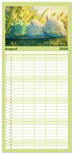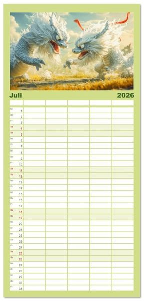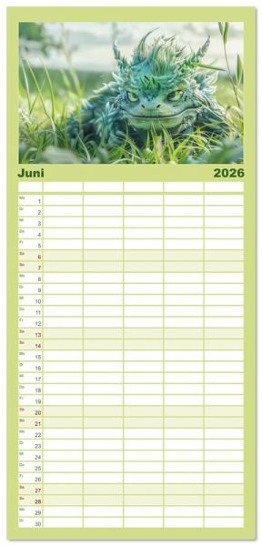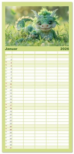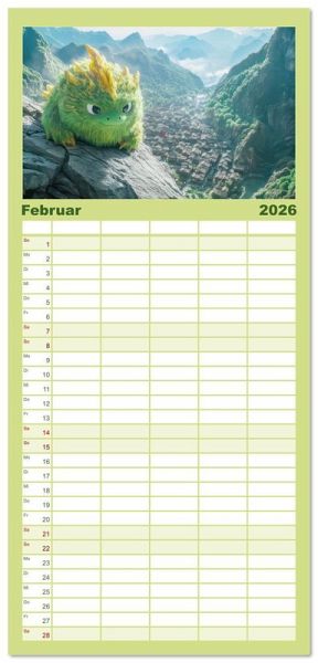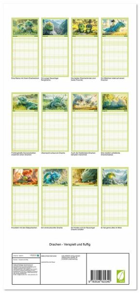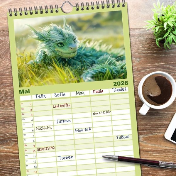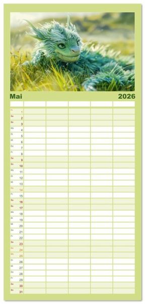 PRAKTISCH - übersichtlicher Familienkalender mit 5 Spalten für bis zu 5 Personen für mehr Struktur im Alltag - so bleiben alle Termine im Blick!ÜBERSICHTLICH - mit farblich getrennten Wochen- und Feiertagen. Die einzelnen Felder bieten genügend Platz für Eintragungen. So macht Organisieren Spaß!FANTASTISCHE BILDER - Dieser Planer ist nicht nur eine nützliche Hilfe im Alltag, sondern schmückt gleichzeitig Ihr Zuhause. Ideal auch als Geschenk.FÜR ALLE STIFTE GEEIGNET - ganz egal, ob Sie lieber mit Kugelschreiber oder Bleistift schreiben.NACHHALTIG - deutliche Abfallreduzierung durch bedarfsgerechte Einzelstückfertigung, umweltfreundliches FSC-zertifiziertes Papier, Produktion in Deutschland, klimabewusste Logistik.Kuschelige flauschige Drachen von Autor(in): Liselotte Brunner-Klaus