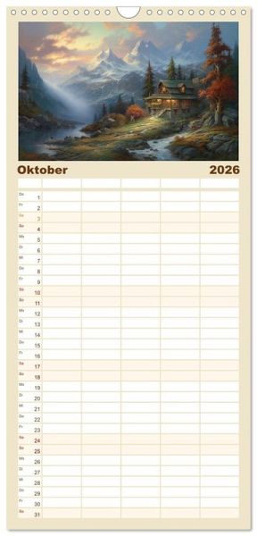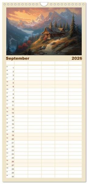 PRAKTISCH - übersichtlicher Familienkalender mit 5 Spalten für bis zu 5 Personen für mehr Struktur im Alltag - so bleiben alle Termine im Blick!ÜBERSICHTLICH - mit farblich getrennten Wochen- und Feiertagen. Die einzelnen Felder bieten genügend Platz für Eintragungen. So macht Organisieren Spaß!FANTASTISCHE BILDER - Dieser Planer ist nicht nur eine nützliche Hilfe im Alltag, sondern schmückt gleichzeitig Ihr Zuhause. Ideal auch als Geschenk.FÜR ALLE STIFTE GEEIGNET - ganz egal, ob Sie lieber mit Kugelschreiber oder Bleistift schreiben.NACHHALTIG - deutliche Abfallreduzierung durch bedarfsgerechte Einzelstückfertigung, umweltfreundliches FSC-zertifiziertes Papier, Produktion in Deutschland, klimabewusste Logistik.Das Haus in den Bergen ist eine charmante und rustikale Rückzugoase mit atemberaubender Aussicht. von Autor(in): Steffen Gierok ; Magik Artist Design
