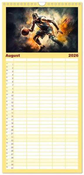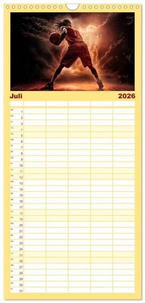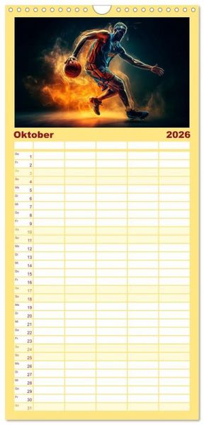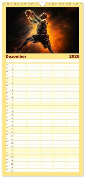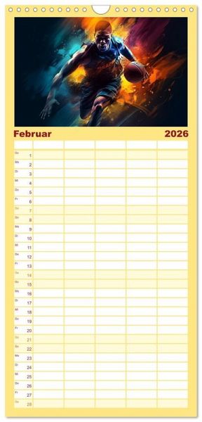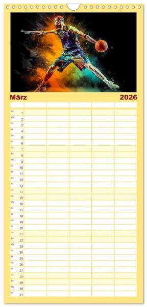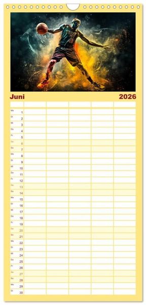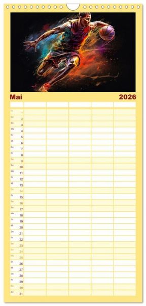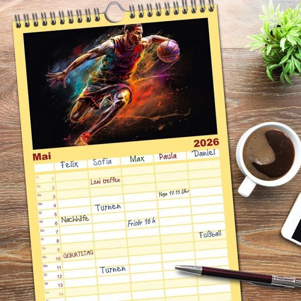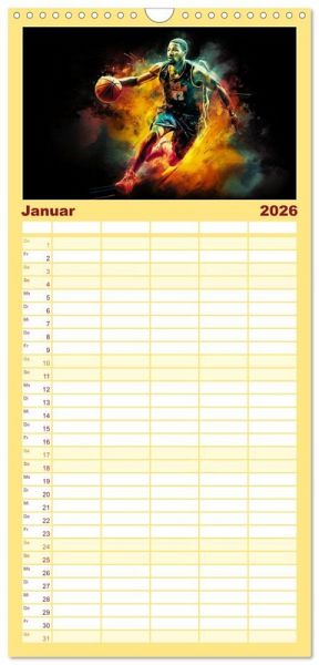 PRAKTISCH - übersichtlicher Familienkalender mit 5 Spalten für bis zu 5 Personen für mehr Struktur im Alltag - so bleiben alle Termine im Blick!ÜBERSICHTLICH - mit farblich getrennten Wochen- und Feiertagen. Die einzelnen Felder bieten genügend Platz für Eintragungen. So macht Organisieren Spaß!FANTASTISCHE BILDER - Dieser Planer ist nicht nur eine nützliche Hilfe im Alltag, sondern schmückt gleichzeitig Ihr Zuhause. Ideal auch als Geschenk.FÜR ALLE STIFTE GEEIGNET - ganz egal, ob Sie lieber mit Kugelschreiber oder Bleistift schreiben.NACHHALTIG - deutliche Abfallreduzierung durch bedarfsgerechte Einzelstückfertigung, umweltfreundliches FSC-zertifiziertes Papier, Produktion in Deutschland, klimabewusste Logistik.Zwölf farbenprächtige Bilder von Basketballspielern in Action von Autor(in): Dirk Meutzner