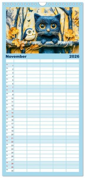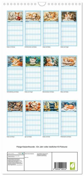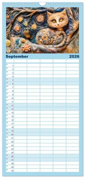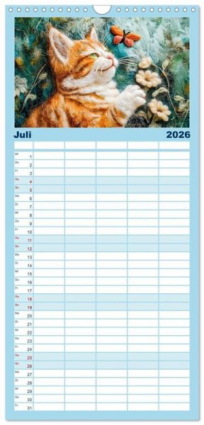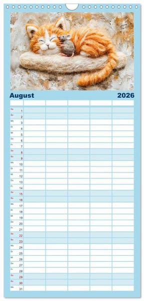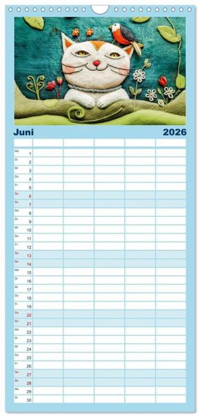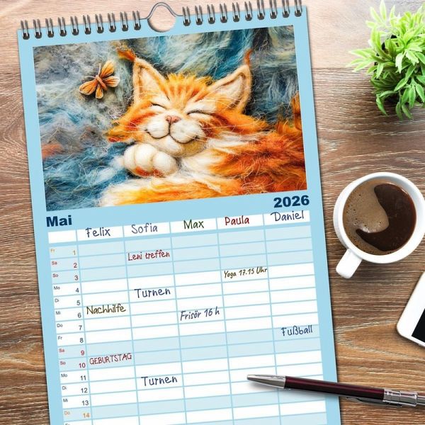 PRAKTISCH - übersichtlicher Familienkalender mit 5 Spalten für bis zu 5 Personen für mehr Struktur im Alltag - so bleiben alle Termine im Blick!ÜBERSICHTLICH - mit farblich getrennten Wochen- und Feiertagen. Die einzelnen Felder bieten genügend Platz für Eintragungen. So macht Organisieren Spaß!FANTASTISCHE BILDER - Dieser Planer ist nicht nur eine nützliche Hilfe im Alltag, sondern schmückt gleichzeitig Ihr Zuhause. Ideal auch als Geschenk.FÜR ALLE STIFTE GEEIGNET - ganz egal, ob Sie lieber mit Kugelschreiber oder Bleistift schreiben.NACHHALTIG - deutliche Abfallreduzierung durch bedarfsgerechte Einzelstückfertigung, umweltfreundliches FSC-zertifiziertes Papier, Produktion in Deutschland, klimabewusste Logistik.Kunstvolle Filzkatzen, die mit ihrer niedlichen Ausstrahlung dasganze Jahr erfreuen. von Autor(in): Anja Frost