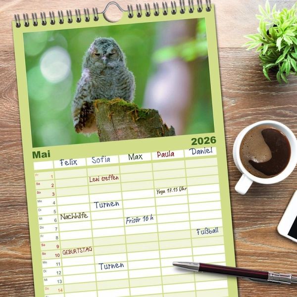 PRAKTISCH - übersichtlicher Familienkalender mit 5 Spalten für bis zu 5 Personen für mehr Struktur im Alltag - so bleiben alle Termine im Blick!ÜBERSICHTLICH - mit farblich getrennten Wochen- und Feiertagen. Die einzelnen Felder bieten genügend Platz für Eintragungen. So macht Organisieren Spaß!FANTASTISCHE BILDER - Dieser Planer ist nicht nur eine nützliche Hilfe im Alltag, sondern schmückt gleichzeitig Ihr Zuhause. Ideal auch als Geschenk.FÜR ALLE STIFTE GEEIGNET - ganz egal, ob Sie lieber mit Kugelschreiber oder Bleistift schreiben.NACHHALTIG - deutliche Abfallreduzierung durch bedarfsgerechte Einzelstückfertigung, umweltfreundliches FSC-zertifiziertes Papier, Produktion in Deutschland, klimabewusste Logistik.Die Waldkauz-Ästlinge haben gerade erst ihre Bruthöhle verlassen und erkunden hüpfend und kletternd ihre Umgebung, lange bevor sie richtig fliegen können. von Autor(in): Kauzfreund.info