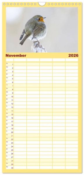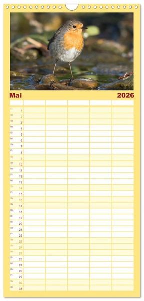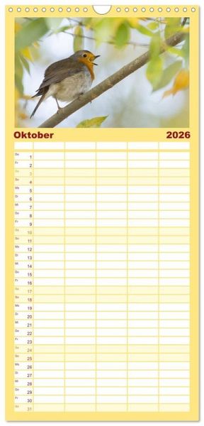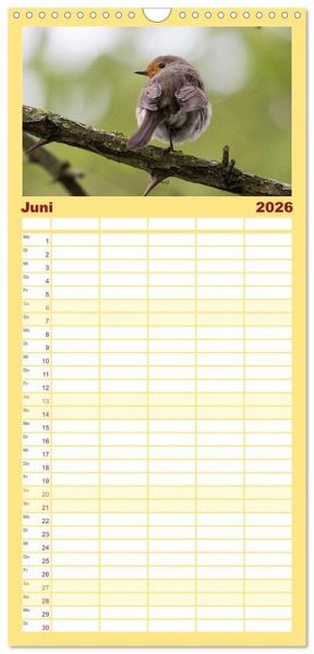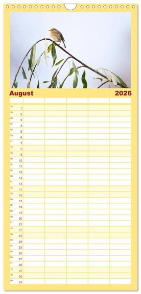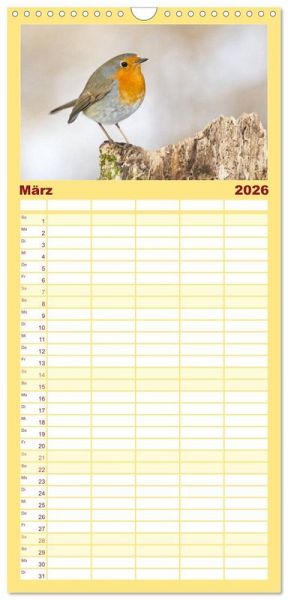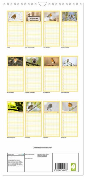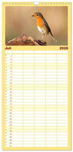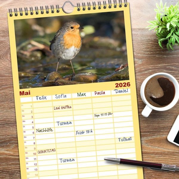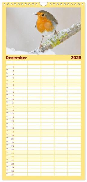 übersichtlicher Familienkalender mit 5 Spalten für bis zu 5 Personen für mehr Struktur im Alltag - so bleiben alle Termine im Blick!ÜBERSICHTLICH - mit farblich getrennten Wochen- und Feiertagen. Die einzelnen Felder bieten genügend Platz für Eintragungen. So macht Organisieren Spaß!FANTASTISCHE BILDER - Dieser Planer ist nicht nur eine nützliche Hilfe im Alltag, sondern schmückt gleichzeitig Ihr Zuhause. Ideal auch als Geschenk.FÜR ALLE STIFTE GEEIGNET - ganz egal, ob Sie lieber mit Kugelschreiber oder Bleistift schreiben.NACHHALTIG - deutliche Abfallreduzierung durch bedarfsgerechte Einzelstückfertigung, umweltfreundliches FSC-zertifiziertes Papier, Produktion in Deutschland, klimabewusste Logistik.Das anmutige Rotkehlchen präsentiert sich im Lauf der Jahreszeiten von Autor(in): Wilfried Martin