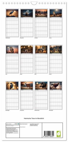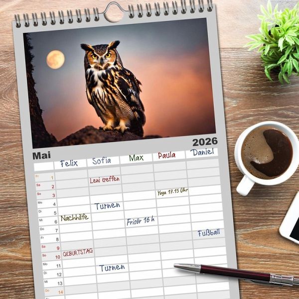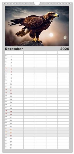 PRAKTISCH - übersichtlicher Familienkalender mit 5 Spalten für bis zu 5 Personen für mehr Struktur im Alltag - so bleiben alle Termine im Blick!ÜBERSICHTLICH - mit farblich getrennten Wochen- und Feiertagen. Die einzelnen Felder bieten genügend Platz für Eintragungen. So macht Organisieren Spaß!FANTASTISCHE BILDER - Dieser Planer ist nicht nur eine nützliche Hilfe im Alltag, sondern schmückt gleichzeitig Ihr Zuhause. Ideal auch als Geschenk.FÜR ALLE STIFTE GEEIGNET - ganz egal, ob Sie lieber mit Kugelschreiber oder Bleistift schreiben.NACHHALTIG - deutliche Abfallreduzierung durch bedarfsgerechte Einzelstückfertigung, umweltfreundliches FSC-zertifiziertes Papier, Produktion in Deutschland, klimabewusste Logistik.Wolf, Adler und Co. von der KI in Szene gesetzt von Autor(in): Claudia Kleemann
