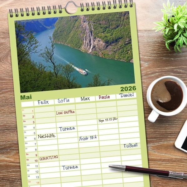 PRAKTISCH - übersichtlicher Familienkalender mit 5 Spalten für bis zu 5 Personen für mehr Struktur im Alltag - so bleiben alle Termine im Blick!ÜBERSICHTLICH - mit farblich getrennten Wochen- und Feiertagen. Die einzelnen Felder bieten genügend Platz für Eintragungen. So macht Organisieren Spaß!FANTASTISCHE BILDER - Dieser Planer ist nicht nur eine nützliche Hilfe im Alltag, sondern schmückt gleichzeitig Ihr Zuhause. Ideal auch als Geschenk.FÜR ALLE STIFTE GEEIGNET - ganz egal, ob Sie lieber mit Kugelschreiber oder Bleistift schreiben.NACHHALTIG - deutliche Abfallreduzierung durch bedarfsgerechte Einzelstückfertigung, umweltfreundliches FSC-zertifiziertes Papier, Produktion in Deutschland, klimabewusste Logistik.Eine Fahrt durch eine faszinierende Fjordlandschaft von Autor(in): Matthias Hanke