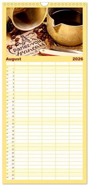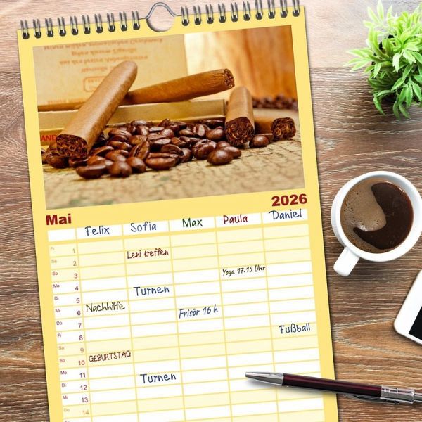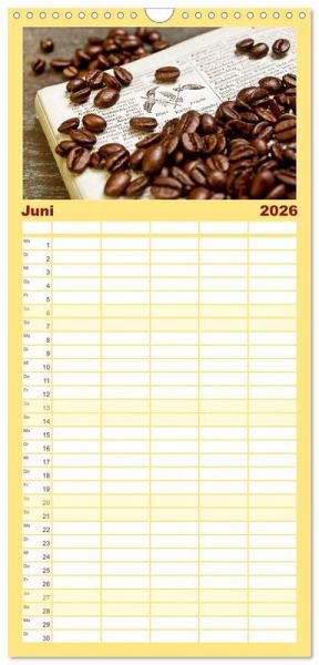 PRAKTISCH - übersichtlicher Familienkalender mit 5 Spalten für bis zu 5 Personen für mehr Struktur im Alltag - so bleiben alle Termine im Blick!ÜBERSICHTLICH - mit farblich getrennten Wochen- und Feiertagen. Die einzelnen Felder bieten genügend Platz für Eintragungen. So macht Organisieren Spaß!FANTASTISCHE BILDER - Dieser Planer ist nicht nur eine nützliche Hilfe im Alltag, sondern schmückt gleichzeitig Ihr Zuhause. Ideal auch als Geschenk.FÜR ALLE STIFTE GEEIGNET - ganz egal, ob Sie lieber mit Kugelschreiber oder Bleistift schreiben.NACHHALTIG - deutliche Abfallreduzierung durch bedarfsgerechte Einzelstückfertigung, umweltfreundliches FSC-zertifiziertes Papier, Produktion in Deutschland, klimabewusste Logistik.Der Kalender präsentiert 12 stimmungsvolle Stillleben rund um das Thema Kaffee von Autor(in): Ralph Kerpa