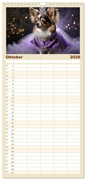 Oktober: Chihuahua trägt lila Abendkleid mit Glitzer und Krone