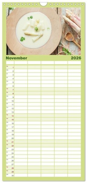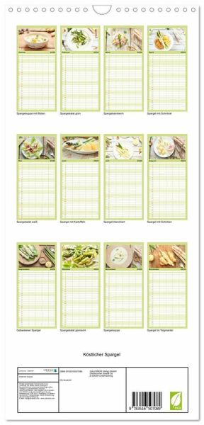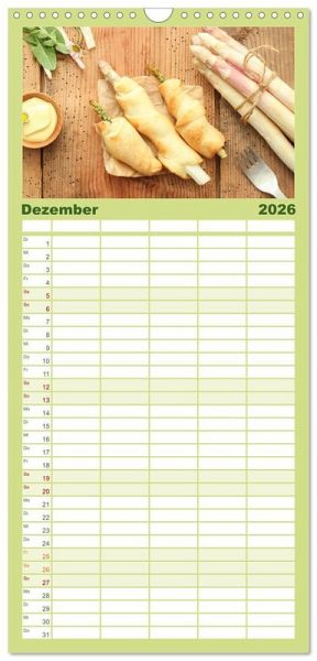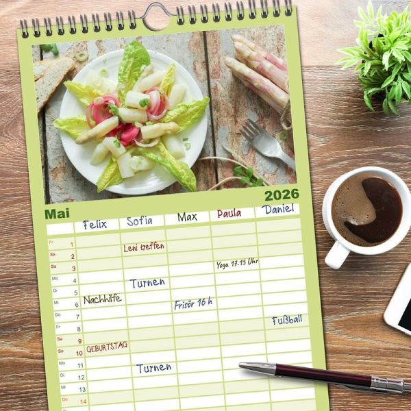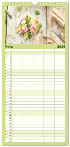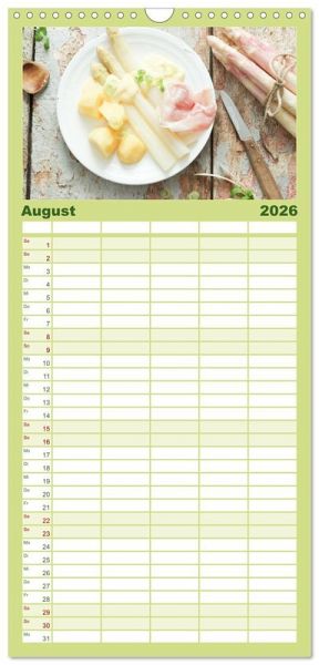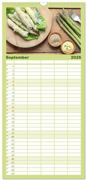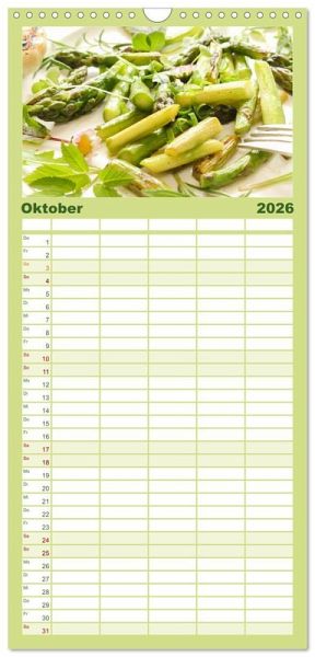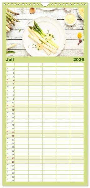 PRAKTISCH - übersichtlicher Familienkalender mit 5 Spalten für bis zu 5 Personen für mehr Struktur im Alltag - so bleiben alle Termine im Blick!ÜBERSICHTLICH - mit farblich getrennten Wochen- und Feiertagen. Die einzelnen Felder bieten genügend Platz für Eintragungen. So macht Organisieren Spaß!FANTASTISCHE BILDER - Dieser Planer ist nicht nur eine nützliche Hilfe im Alltag, sondern schmückt gleichzeitig Ihr Zuhause. Ideal auch als Geschenk.FÜR ALLE STIFTE GEEIGNET - ganz egal, ob Sie lieber mit Kugelschreiber oder Bleistift schreiben.NACHHALTIG - deutliche Abfallreduzierung durch bedarfsgerechte Einzelstückfertigung, umweltfreundliches FSC-zertifiziertes Papier, Produktion in Deutschland, klimabewusste Logistik.Viele tolle Spargelgerichte für jeden Monat. von Autor(in): EFLStudioArt