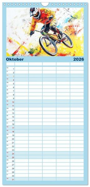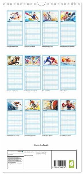 PRAKTISCH - übersichtlicher Familienkalender mit 5 Spalten für bis zu 5 Personen für mehr Struktur im Alltag - so bleiben alle Termine im Blick!ÜBERSICHTLICH - mit farblich getrennten Wochen- und Feiertagen. Die einzelnen Felder bieten genügend Platz für Eintragungen. So macht Organisieren Spaß!FANTASTISCHE BILDER - Dieser Planer ist nicht nur eine nützliche Hilfe im Alltag, sondern schmückt gleichzeitig Ihr Zuhause. Ideal auch als Geschenk.FÜR ALLE STIFTE GEEIGNET - ganz egal, ob Sie lieber mit Kugelschreiber oder Bleistift schreiben.NACHHALTIG - deutliche Abfallreduzierung durch bedarfsgerechte Einzelstückfertigung, umweltfreundliches FSC-zertifiziertes Papier, Produktion in Deutschland, klimabewusste Logistik.Erleben Sie die Schönheit und Energie olympischer Sportarten durch lebendige und fesselnde Gemälde. von Autor(in): Marie-Ange Pagnon