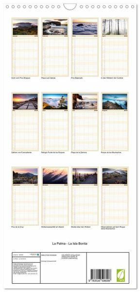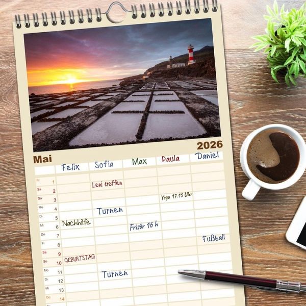 PRAKTISCH - übersichtlicher Familienkalender mit 5 Spalten für bis zu 5 Personen für mehr Struktur im Alltag - so bleiben alle Termine im Blick!ÜBERSICHTLICH - mit farblich getrennten Wochen- und Feiertagen. Die einzelnen Felder bieten genügend Platz für Eintragungen. So macht Organisieren Spaß!FANTASTISCHE BILDER - Dieser Planer ist nicht nur eine nützliche Hilfe im Alltag, sondern schmückt gleichzeitig Ihr Zuhause. Ideal auch als Geschenk.FÜR ALLE STIFTE GEEIGNET - ganz egal, ob Sie lieber mit Kugelschreiber oder Bleistift schreiben.NACHHALTIG - deutliche Abfallreduzierung durch bedarfsgerechte Einzelstückfertigung, umweltfreundliches FSC-zertifiziertes Papier, Produktion in Deutschland, klimabewusste Logistik.Eine Reise zur grünen Insel La Palma von Autor(in): Christoph Schaarschmidt
