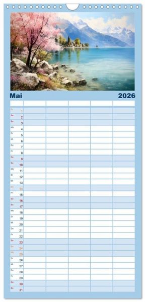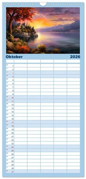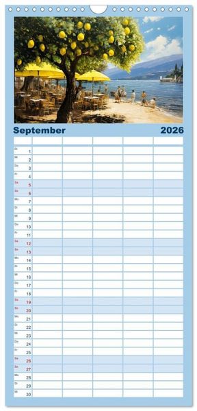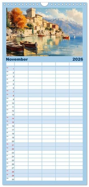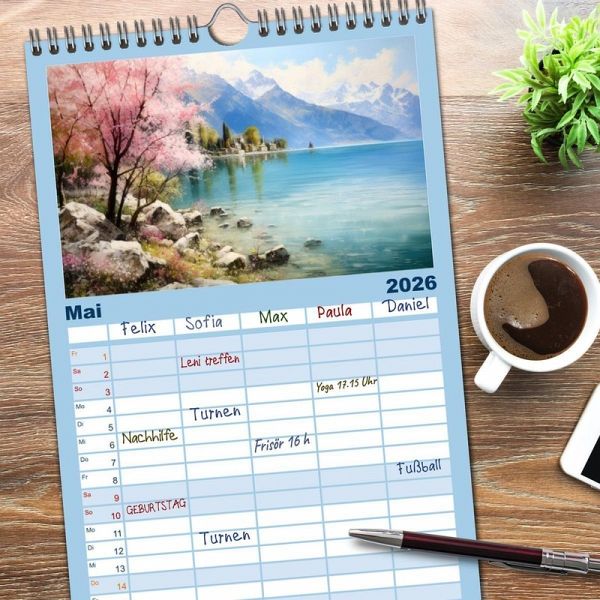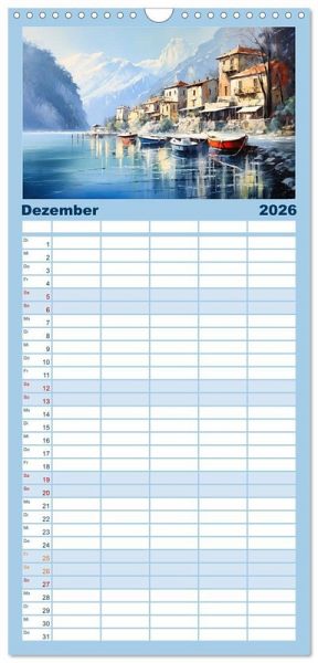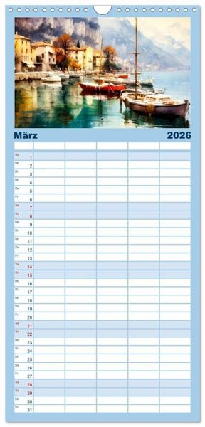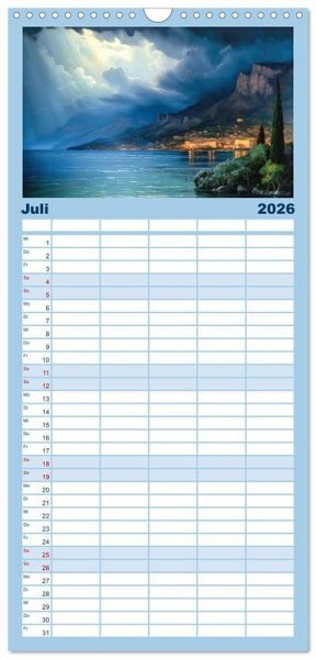 ichtlicher Familienkalender mit 5 Spalten für bis zu 5 Personen für mehr Struktur im Alltag - so bleiben alle Termine im Blick!ÜBERSICHTLICH - mit farblich getrennten Wochen- und Feiertagen. Die einzelnen Felder bieten genügend Platz für Eintragungen. So macht Organisieren Spaß!FANTASTISCHE BILDER - Dieser Planer ist nicht nur eine nützliche Hilfe im Alltag, sondern schmückt gleichzeitig Ihr Zuhause. Ideal auch als Geschenk.FÜR ALLE STIFTE GEEIGNET - ganz egal, ob Sie lieber mit Kugelschreiber oder Bleistift schreiben.NACHHALTIG - deutliche Abfallreduzierung durch bedarfsgerechte Einzelstückfertigung, umweltfreundliches FSC-zertifiziertes Papier, Produktion in Deutschland, klimabewusste Logistik.Gemälde mit italienischem Flair von Autor(in): Sabine Löwer