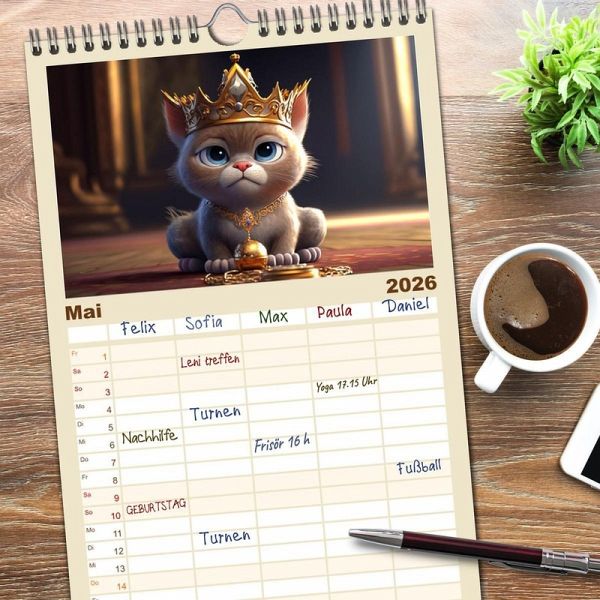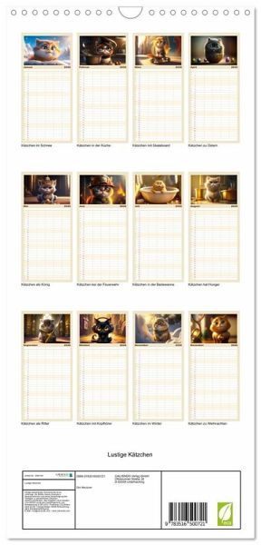 PRAKTISCH - übersichtlicher Familienkalender mit 5 Spalten für bis zu 5 Personen für mehr Struktur im Alltag - so bleiben alle Termine im Blick!ÜBERSICHTLICH - mit farblich getrennten Wochen- und Feiertagen. Die einzelnen Felder bieten genügend Platz für Eintragungen. So macht Organisieren Spaß!FANTASTISCHE BILDER - Dieser Planer ist nicht nur eine nützliche Hilfe im Alltag, sondern schmückt gleichzeitig Ihr Zuhause. Ideal auch als Geschenk.FÜR ALLE STIFTE GEEIGNET - ganz egal, ob Sie lieber mit Kugelschreiber oder Bleistift schreiben.NACHHALTIG - deutliche Abfallreduzierung durch bedarfsgerechte Einzelstückfertigung, umweltfreundliches FSC-zertifiziertes Papier, Produktion in Deutschland, klimabewusste Logistik.Süßer geht es kaum, zwölf witzige Katzenbilder für jeden Tierliebhaber von Autor(in): Dirk Meutzner