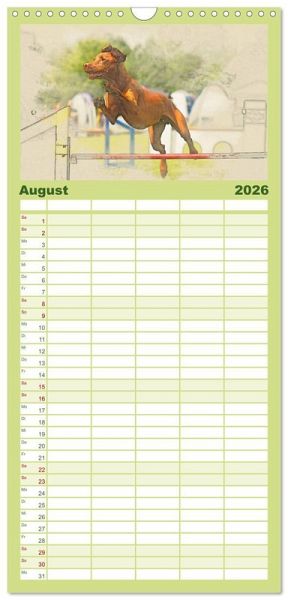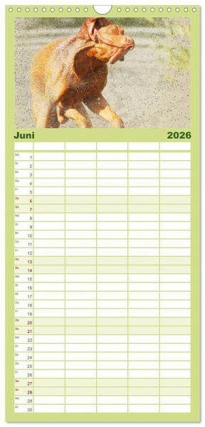 PRAKTISCH - übersichtlicher Familienkalender mit 5 Spalten für bis zu 5 Personen für mehr Struktur im Alltag - so bleiben alle Termine im Blick!ÜBERSICHTLICH - mit farblich getrennten Wochen- und Feiertagen. Die einzelnen Felder bieten genügend Platz für Eintragungen. So macht Organisieren Spaß!FANTASTISCHE BILDER - Dieser Planer ist nicht nur eine nützliche Hilfe im Alltag, sondern schmückt gleichzeitig Ihr Zuhause. Ideal auch als Geschenk.FÜR ALLE STIFTE GEEIGNET - ganz egal, ob Sie lieber mit Kugelschreiber oder Bleistift schreiben.NACHHALTIG - deutliche Abfallreduzierung durch bedarfsgerechte Einzelstückfertigung, umweltfreundliches FSC-zertifiziertes Papier, Produktion in Deutschland, klimabewusste Logistik.Ungarische Vorstehhunde (Magyar Vizsla) im kunstvollen Aquarell-Stil. Jedes Monatsmotiv gleicht einem kleinen Kunstwerk von Autor(in): Andrea Redecker