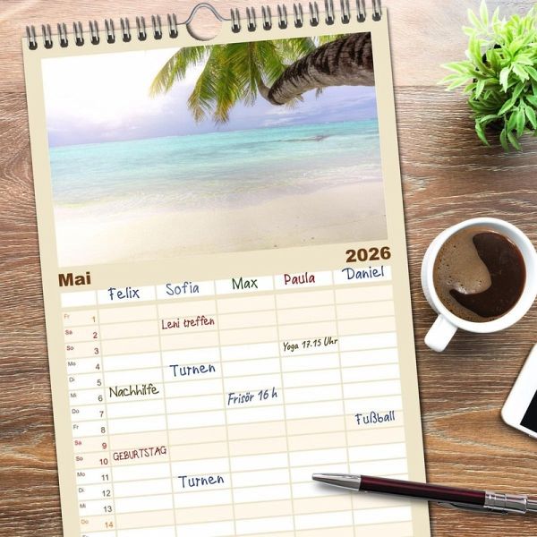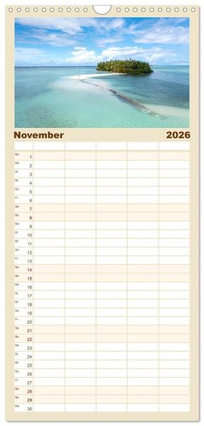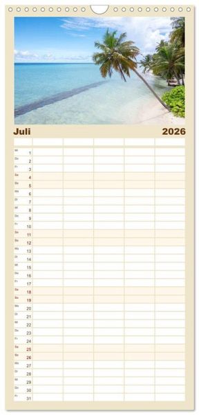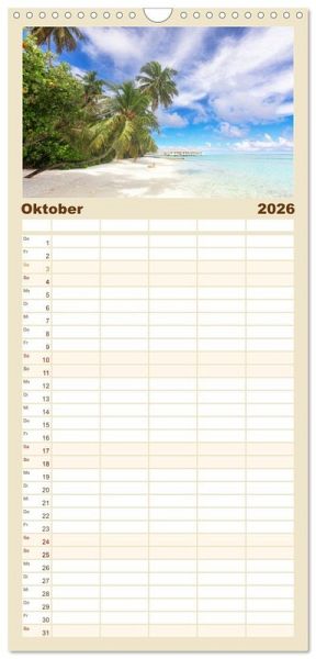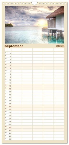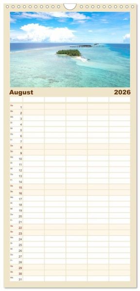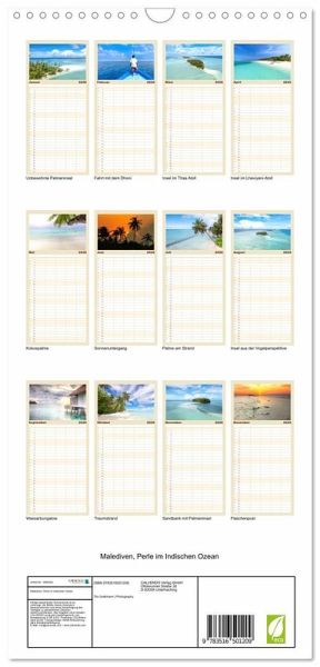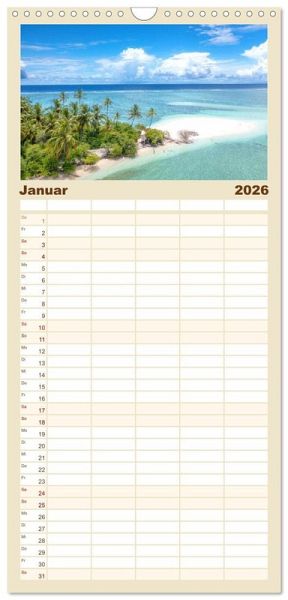 PRAKTISCH - übersichtlicher Familienkalender mit 5 Spalten für bis zu 5 Personen für mehr Struktur im Alltag - so bleiben alle Termine im Blick!ÜBERSICHTLICH - mit farblich getrennten Wochen- und Feiertagen. Die einzelnen Felder bieten genügend Platz für Eintragungen. So macht Organisieren Spaß!FANTASTISCHE BILDER - Dieser Planer ist nicht nur eine nützliche Hilfe im Alltag, sondern schmückt gleichzeitig Ihr Zuhause. Ideal auch als Geschenk.FÜR ALLE STIFTE GEEIGNET - ganz egal, ob Sie lieber mit Kugelschreiber oder Bleistift schreiben.NACHHALTIG - deutliche Abfallreduzierung durch bedarfsgerechte Einzelstückfertigung, umweltfreundliches FSC-zertifiziertes Papier, Produktion in Deutschland, klimabewusste Logistik.Die Schönheit der Malediven mit der Kamera eingefangen. von Autor(in): Tilo Grellmann