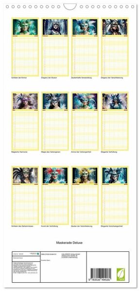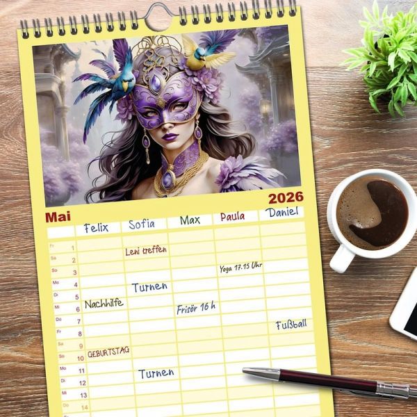 PRAKTISCH - übersichtlicher Familienkalender mit 5 Spalten für bis zu 5 Personen für mehr Struktur im Alltag - so bleiben alle Termine im Blick!ÜBERSICHTLICH - mit farblich getrennten Wochen- und Feiertagen. Die einzelnen Felder bieten genügend Platz für Eintragungen. So macht Organisieren Spaß!FANTASTISCHE BILDER - Dieser Planer ist nicht nur eine nützliche Hilfe im Alltag, sondern schmückt gleichzeitig Ihr Zuhause. Ideal auch als Geschenk.FÜR ALLE STIFTE GEEIGNET - ganz egal, ob Sie lieber mit Kugelschreiber oder Bleistift schreiben.NACHHALTIG - deutliche Abfallreduzierung durch bedarfsgerechte Einzelstückfertigung, umweltfreundliches FSC-zertifiziertes Papier, Produktion in Deutschland, klimabewusste Logistik.Geheimnisvolle maskierte Damenwelt. von Autor(in): Dusanka Djeric