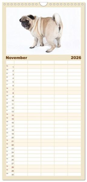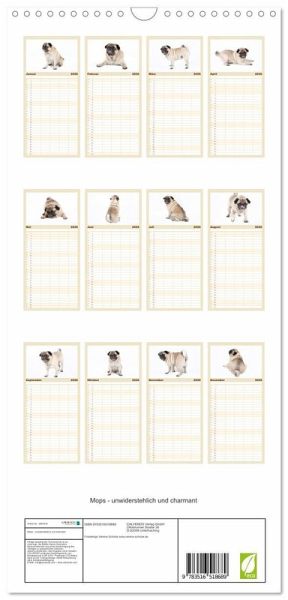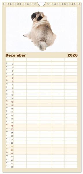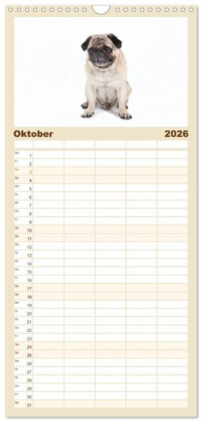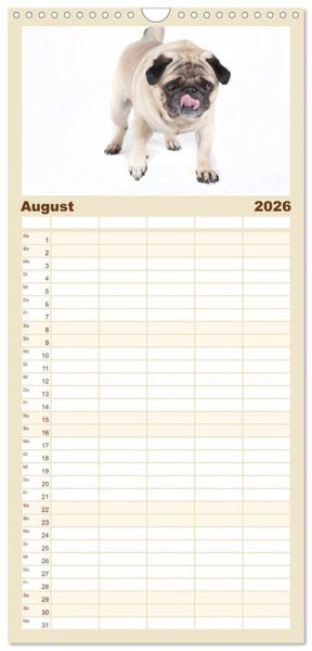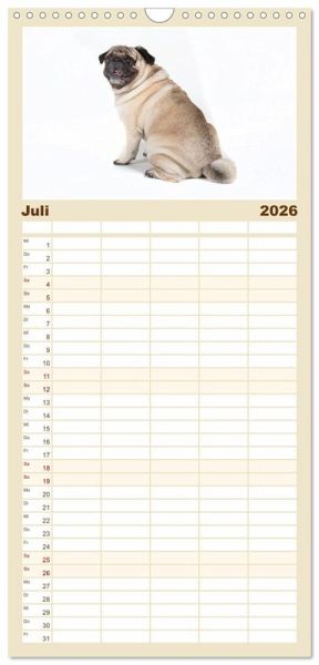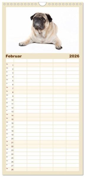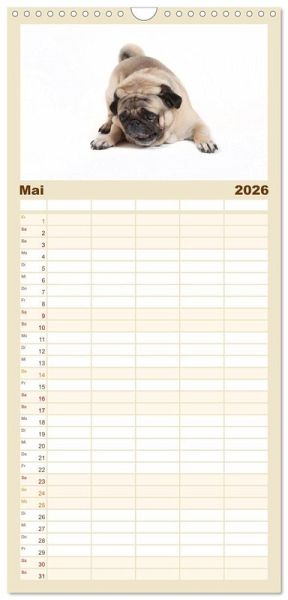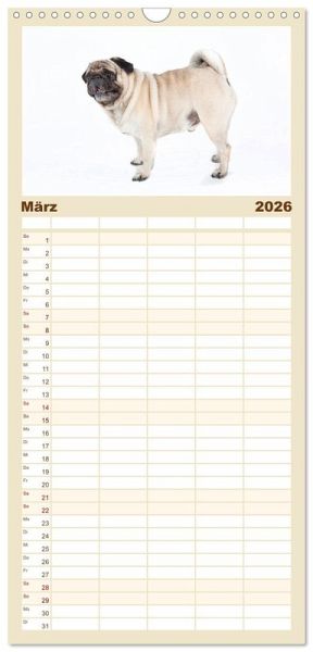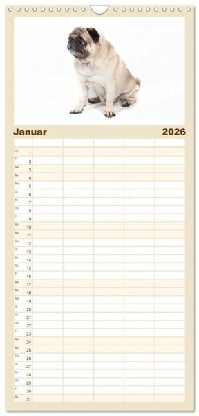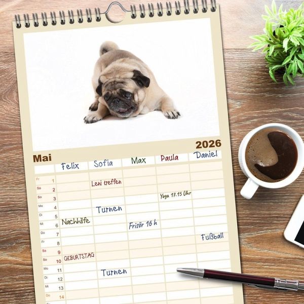 AKTISCH - übersichtlicher Familienkalender mit 5 Spalten für bis zu 5 Personen für mehr Struktur im Alltag - so bleiben alle Termine im Blick!ÜBERSICHTLICH - mit farblich getrennten Wochen- und Feiertagen. Die einzelnen Felder bieten genügend Platz für Eintragungen. So macht Organisieren Spaß!FANTASTISCHE BILDER - Dieser Planer ist nicht nur eine nützliche Hilfe im Alltag, sondern schmückt gleichzeitig Ihr Zuhause. Ideal auch als Geschenk.FÜR ALLE STIFTE GEEIGNET - ganz egal, ob Sie lieber mit Kugelschreiber oder Bleistift schreiben.NACHHALTIG - deutliche Abfallreduzierung durch bedarfsgerechte Einzelstückfertigung, umweltfreundliches FSC-zertifiziertes Papier, Produktion in Deutschland, klimabewusste Logistik.Dieser Kalender zeigt den Mops in verschiedenen Posen in einem reinweißem Kalender. von Autor(in): Fotodesign Verena Scholze