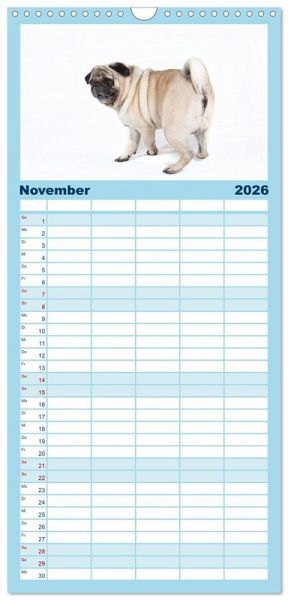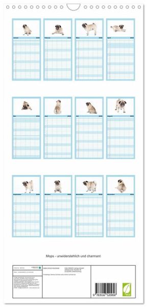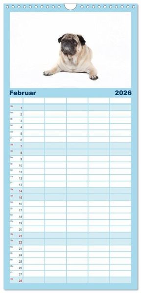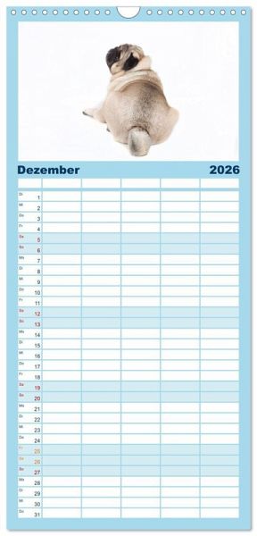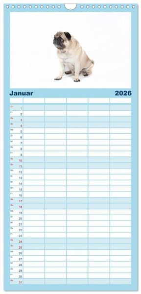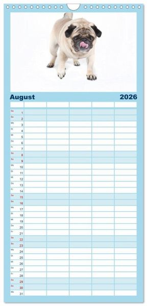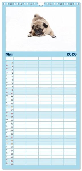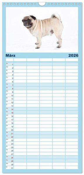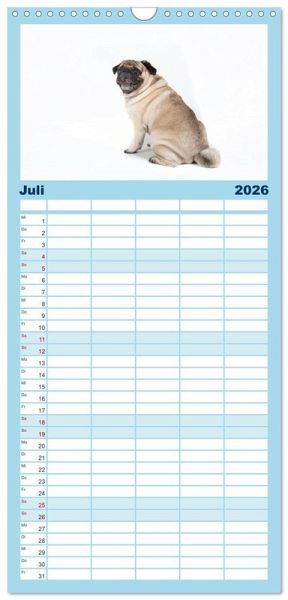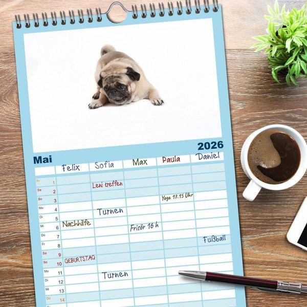 AKTISCH - übersichtlicher Familienkalender mit 5 Spalten für bis zu 5 Personen für mehr Struktur im Alltag - so bleiben alle Termine im Blick!ÜBERSICHTLICH - mit farblich getrennten Wochen- und Feiertagen. Die einzelnen Felder bieten genügend Platz für Eintragungen. So macht Organisieren Spaß!FANTASTISCHE BILDER - Dieser Planer ist nicht nur eine nützliche Hilfe im Alltag, sondern schmückt gleichzeitig Ihr Zuhause. Ideal auch als Geschenk.FÜR ALLE STIFTE GEEIGNET - ganz egal, ob Sie lieber mit Kugelschreiber oder Bleistift schreiben.NACHHALTIG - deutliche Abfallreduzierung durch bedarfsgerechte Einzelstückfertigung, umweltfreundliches FSC-zertifiziertes Papier, Produktion in Deutschland, klimabewusste Logistik.Dieser Kalender zeigt den Mops in verschiedenen Posen in einem reinweißem Kalender. von Autor(in): Fotodesign Verena Scholze