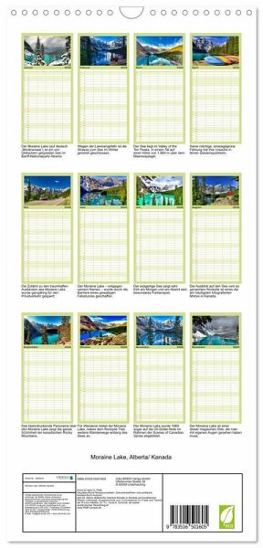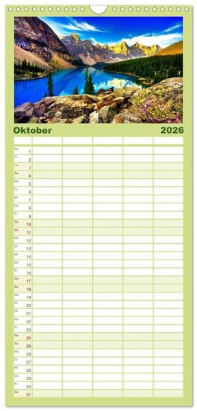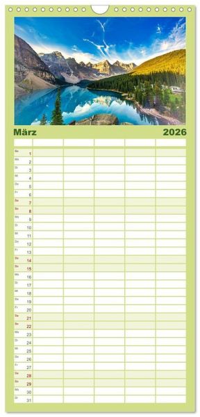 PRAKTISCH - übersichtlicher Familienkalender mit 5 Spalten für bis zu 5 Personen für mehr Struktur im Alltag - so bleiben alle Termine im Blick!ÜBERSICHTLICH - mit farblich getrennten Wochen- und Feiertagen. Die einzelnen Felder bieten genügend Platz für Eintragungen. So macht Organisieren Spaß!FANTASTISCHE BILDER - Dieser Planer ist nicht nur eine nützliche Hilfe im Alltag, sondern schmückt gleichzeitig Ihr Zuhause. Ideal auch als Geschenk.FÜR ALLE STIFTE GEEIGNET - ganz egal, ob Sie lieber mit Kugelschreiber oder Bleistift schreiben.NACHHALTIG - deutliche Abfallreduzierung durch bedarfsgerechte Einzelstückfertigung, umweltfreundliches FSC-zertifiziertes Papier, Produktion in Deutschland, klimabewusste Logistik.Der schönste Bergsee von Kanada im Wechsel der Jahreszeiten. von Autor(in): Hans-Gerhard Pfaff