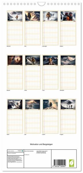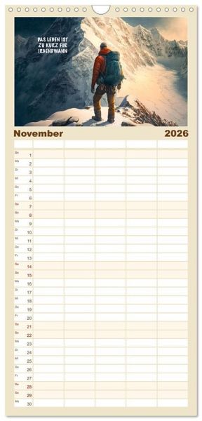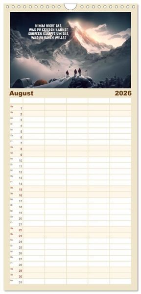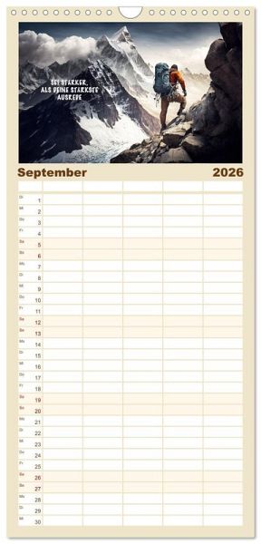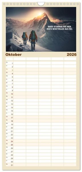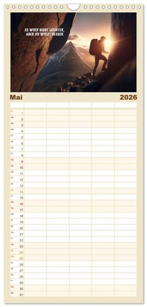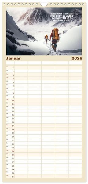 PRAKTISCH - übersichtlicher Familienkalender mit 5 Spalten für bis zu 5 Personen für mehr Struktur im Alltag - so bleiben alle Termine im Blick!ÜBERSICHTLICH - mit farblich getrennten Wochen- und Feiertagen. Die einzelnen Felder bieten genügend Platz für Eintragungen. So macht Organisieren Spaß!FANTASTISCHE BILDER - Dieser Planer ist nicht nur eine nützliche Hilfe im Alltag, sondern schmückt gleichzeitig Ihr Zuhause. Ideal auch als Geschenk.FÜR ALLE STIFTE GEEIGNET - ganz egal, ob Sie lieber mit Kugelschreiber oder Bleistift schreiben.NACHHALTIG - deutliche Abfallreduzierung durch bedarfsgerechte Einzelstückfertigung, umweltfreundliches FSC-zertifiziertes Papier, Produktion in Deutschland, klimabewusste Logistik.Ein beeindruckender Motivationskalender nicht nur für Bergsteiger, mit wirklich tollen Motivationssprüchen von Autor(in): Dirk Meutzner