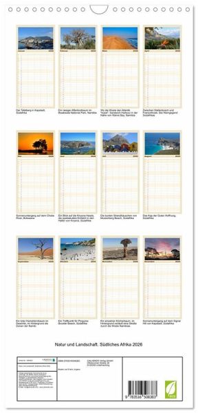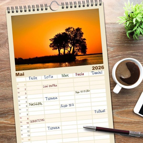PRAKTISCH - übersichtlicher Familienkalender mit 5 Spalten für bis zu 5 Personen für mehr Struktur im Alltag - so bleiben alle Termine im Blick!ÜBERSICHTLICH - mit farblich getrennten Wochen- und Feiertagen. Die einzelnen Felder bieten genügend Platz für Eintragungen. So macht Organisieren Spaß!FANTASTISCHE BILDER - Dieser Planer ist nicht nur eine nützliche Hilfe im Alltag, sondern schmückt gleichzeitig Ihr Zuhause. Ideal auch als Geschenk.FÜR ALLE STIFTE GEEIGNET - ganz egal, ob Sie lieber mit Kugelschreiber oder Bleistift schreiben.NACHHALTIG - deutliche Abfallreduzierung durch bedarfsgerechte Einzelstückfertigung, umweltfreundliches FSC-zertifiziertes Papier, Produktion in Deutschland, klimabewusste Logistik.Spektakuläre, einzigartige Landschaften, wie sie nur der Süden Afrikas zu bieten hat. von Autor(in): Marlen Jürgens