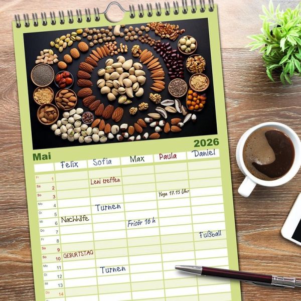 PRAKTISCH - übersichtlicher Familienkalender mit 5 Spalten für bis zu 5 Personen für mehr Struktur im Alltag - so bleiben alle Termine im Blick!ÜBERSICHTLICH - mit farblich getrennten Wochen- und Feiertagen. Die einzelnen Felder bieten genügend Platz für Eintragungen. So macht Organisieren Spaß!FANTASTISCHE BILDER - Dieser Planer ist nicht nur eine nützliche Hilfe im Alltag, sondern schmückt gleichzeitig Ihr Zuhause. Ideal auch als Geschenk.FÜR ALLE STIFTE GEEIGNET - ganz egal, ob Sie lieber mit Kugelschreiber oder Bleistift schreiben.NACHHALTIG - deutliche Abfallreduzierung durch bedarfsgerechte Einzelstückfertigung, umweltfreundliches FSC-zertifiziertes Papier, Produktion in Deutschland, klimabewusste Logistik.Wenn das Auge die schöne Ordnung genießt von Autor(in): Kerstin Waurick