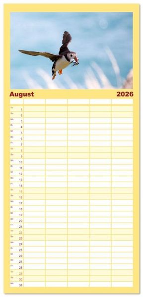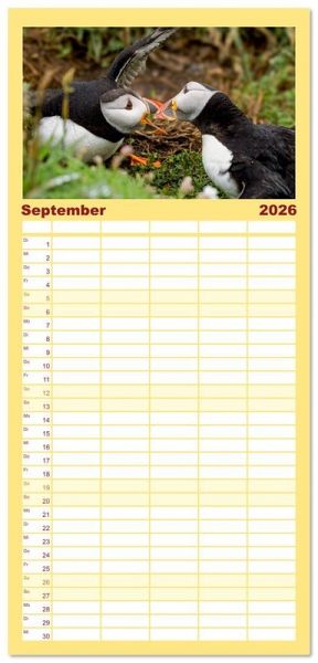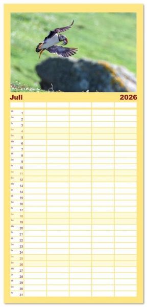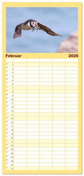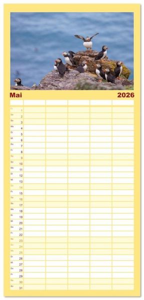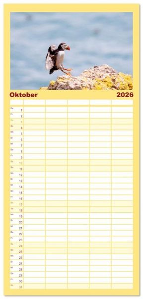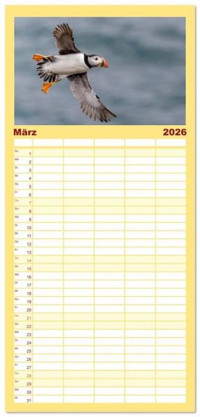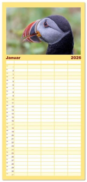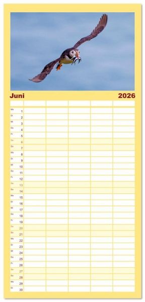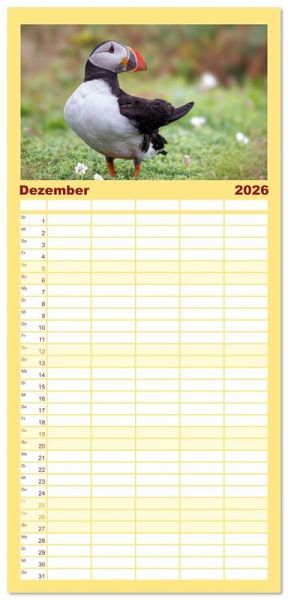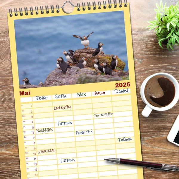PRAKTISCH - übersichtlicher Familienkalender mit 5 Spalten für bis zu 5 Personen für mehr Struktur im Alltag - so bleiben alle Termine im Blick!ÜBERSICHTLICH - mit farblich getrennten Wochen- und Feiertagen. Die einzelnen Felder bieten genügend Platz für Eintragungen. So macht Organisieren Spaß!FANTASTISCHE BILDER - Dieser Planer ist nicht nur eine nützliche Hilfe im Alltag, sondern schmückt gleichzeitig Ihr Zuhause. Ideal auch als Geschenk.FÜR ALLE STIFTE GEEIGNET - ganz egal, ob Sie lieber mit Kugelschreiber oder Bleistift schreiben.NACHHALTIG - deutliche Abfallreduzierung durch bedarfsgerechte Einzelstückfertigung, umweltfreundliches FSC-zertifiziertes Papier, Produktion in Deutschland, klimabewusste Logistik.Papageientaucher - Farbenfrohe Flieger der Natur von Autor(in): ellenlichtenheldt