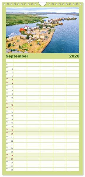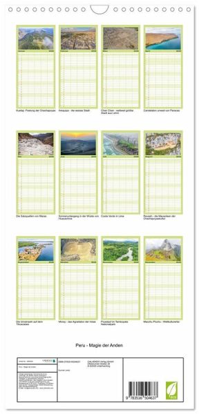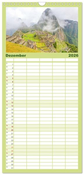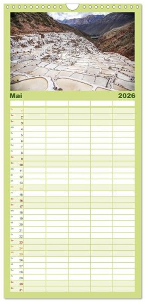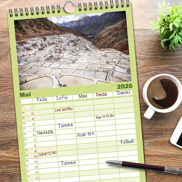 PRAKTISCH - übersichtlicher Familienkalender mit 5 Spalten für bis zu 5 Personen für mehr Struktur im Alltag - so bleiben alle Termine im Blick!ÜBERSICHTLICH - mit farblich getrennten Wochen- und Feiertagen. Die einzelnen Felder bieten genügend Platz für Eintragungen. So macht Organisieren Spaß!FANTASTISCHE BILDER - Dieser Planer ist nicht nur eine nützliche Hilfe im Alltag, sondern schmückt gleichzeitig Ihr Zuhause. Ideal auch als Geschenk.FÜR ALLE STIFTE GEEIGNET - ganz egal, ob Sie lieber mit Kugelschreiber oder Bleistift schreiben.NACHHALTIG - deutliche Abfallreduzierung durch bedarfsgerechte Einzelstückfertigung, umweltfreundliches FSC-zertifiziertes Papier, Produktion in Deutschland, klimabewusste Logistik.Peru - Magie der Anden von Autor(in): Creawes-Photos