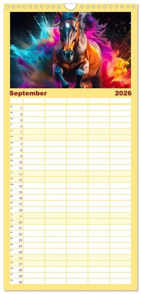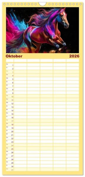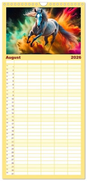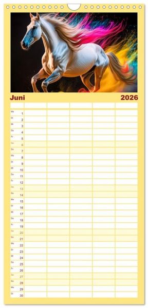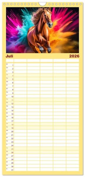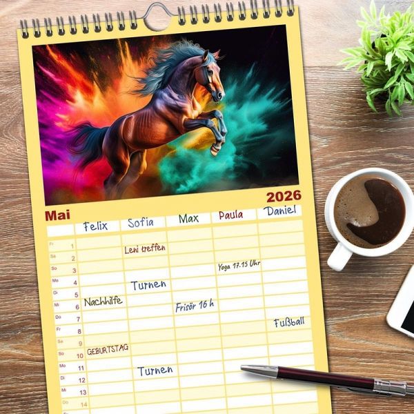 PRAKTISCH - übersichtlicher Familienkalender mit 5 Spalten für bis zu 5 Personen für mehr Struktur im Alltag - so bleiben alle Termine im Blick!ÜBERSICHTLICH - mit farblich getrennten Wochen- und Feiertagen. Die einzelnen Felder bieten genügend Platz für Eintragungen. So macht Organisieren Spaß!FANTASTISCHE BILDER - Dieser Planer ist nicht nur eine nützliche Hilfe im Alltag, sondern schmückt gleichzeitig Ihr Zuhause. Ideal auch als Geschenk.FÜR ALLE STIFTE GEEIGNET - ganz egal, ob Sie lieber mit Kugelschreiber oder Bleistift schreiben.NACHHALTIG - deutliche Abfallreduzierung durch bedarfsgerechte Einzelstückfertigung, umweltfreundliches FSC-zertifiziertes Papier, Produktion in Deutschland, klimabewusste Logistik.Farbenexplosionen in Pferdehufen von Autor(in): Fotodesign Verena Scholze