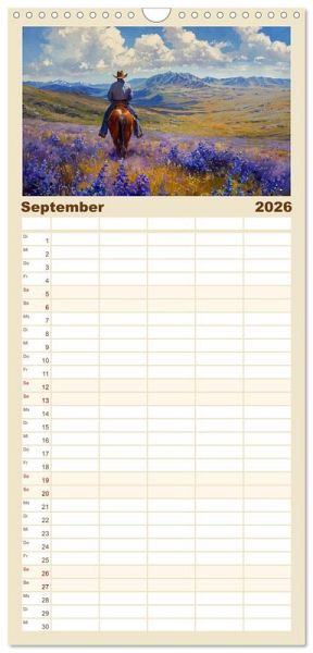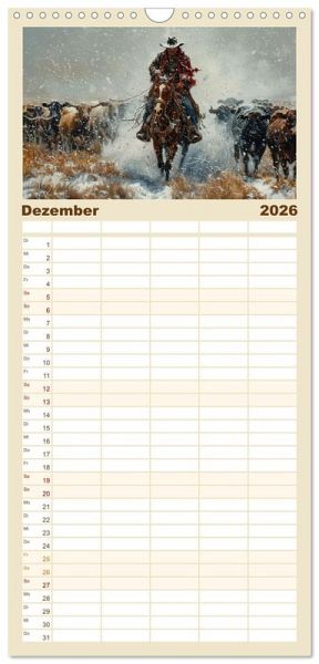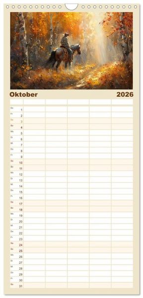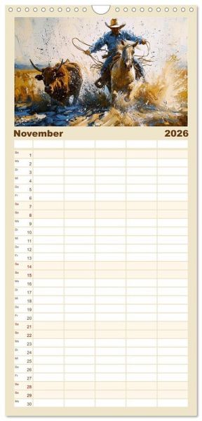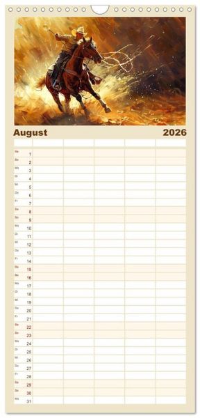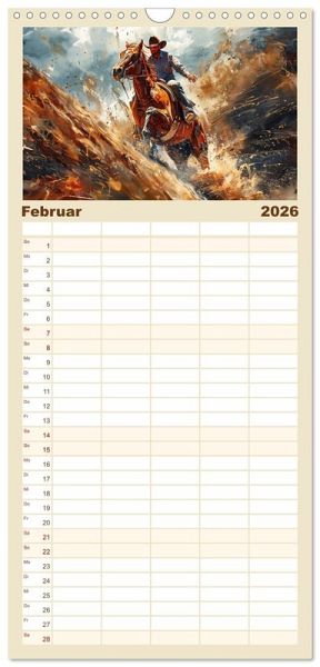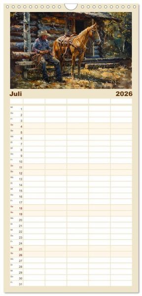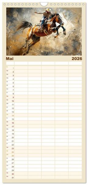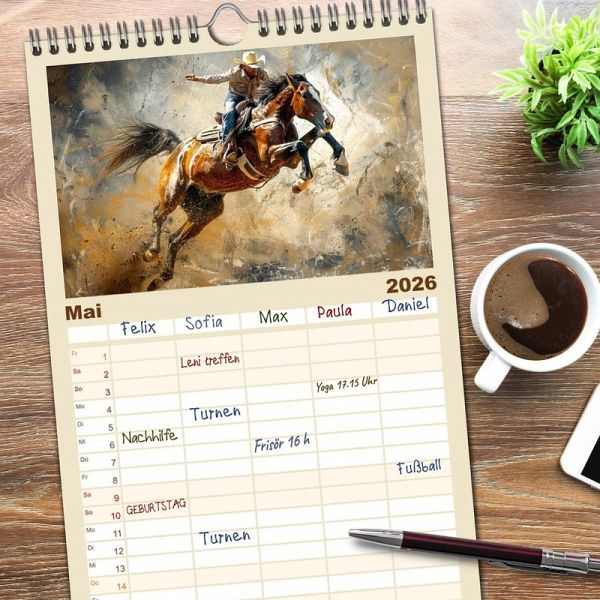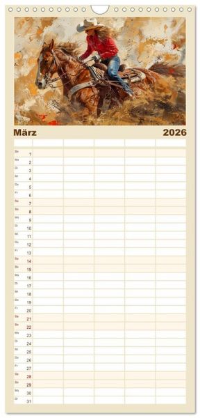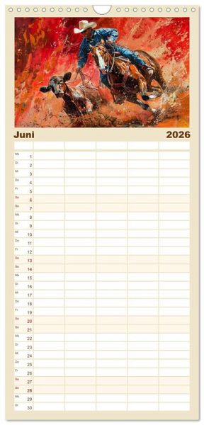 PRAKTISCH - übersichtlicher Familienkalender mit 5 Spalten für bis zu 5 Personen für mehr Struktur im Alltag - so bleiben alle Termine im Blick!ÜBERSICHTLICH - mit farblich getrennten Wochen- und Feiertagen. Die einzelnen Felder bieten genügend Platz für Eintragungen. So macht Organisieren Spaß!FANTASTISCHE BILDER - Dieser Planer ist nicht nur eine nützliche Hilfe im Alltag, sondern schmückt gleichzeitig Ihr Zuhause. Ideal auch als Geschenk.FÜR ALLE STIFTE GEEIGNET - ganz egal, ob Sie lieber mit Kugelschreiber oder Bleistiftschreiben.NACHHALTIG - deutliche Abfallreduzierung durch bedarfsgerechte Einzelstückfertigung, umweltfreundliches FSC-zertifiziertes Papier, Produktion in Deutschland, klimabewusste Logistik.Die Faszination des Westernreitens in Gemälden von Autor(in): Kerstin Waurick