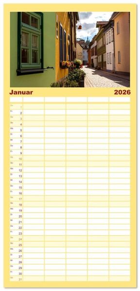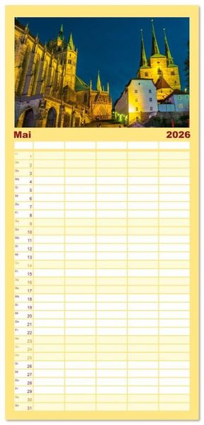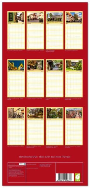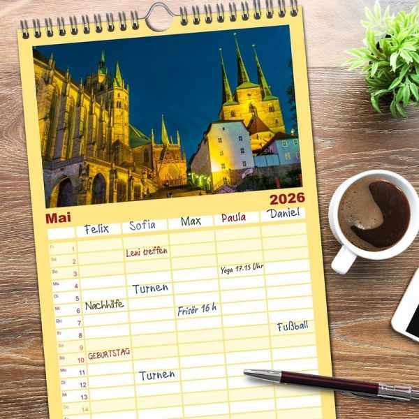 PRAKTISCH - übersichtlicher Familienkalender mit 5 Spalten für bis zu 5 Personen für mehr Struktur im Alltag - so bleiben alle Termine im Blick!ÜBERSICHTLICH - mit farblich getrennten Wochen- und Feiertagen. Die einzelnen Felder bieten genügend Platz für Eintragungen. So macht Organisieren Spaß!FANTASTISCHE BILDER - Dieser Planer ist nicht nur eine nützliche Hilfe im Alltag, sondern schmückt gleichzeitig Ihr Zuhause. Ideal auch als Geschenk.FÜR ALLE STIFTEGEEIGNET - ganz egal, ob Sie lieber mit Kugelschreiber oder Bleistift schreiben.NACHHALTIG - deutliche Abfallreduzierung durch bedarfsgerechte Einzelstückfertigung, umweltfreundliches FSC-zertifiziertes Papier, Produktion in Deutschland, klimabewusste Logistik.Romantische Ansichten der Landeshauptstadt Erfurt von Autor(in): drachenkind-fotografie
