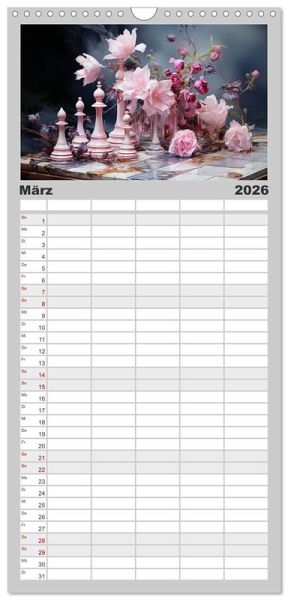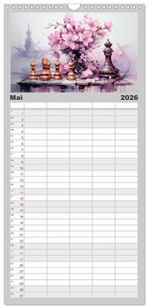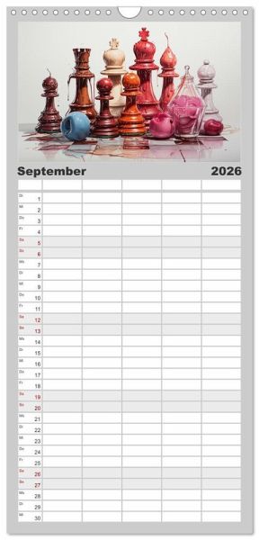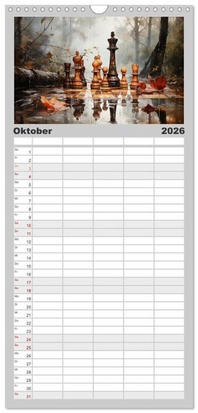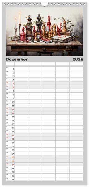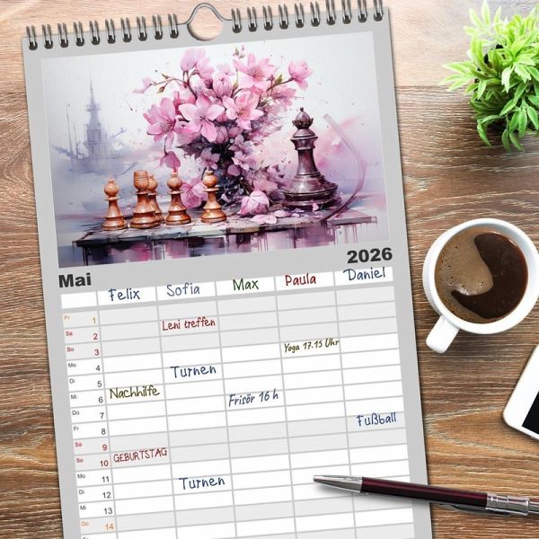 PRAKTISCH - übersichtlicher Familienkalender mit 5 Spalten für bis zu 5 Personen für mehr Struktur im Alltag - so bleiben alle Termine im Blick!ÜBERSICHTLICH - mit farblich getrennten Wochen- und Feiertagen. Die einzelnen Felder bieten genügend Platz für Eintragungen. So macht Organisieren Spaß!FANTASTISCHE BILDER - Dieser Planer ist nicht nur eine nützliche Hilfe im Alltag, sondern schmückt gleichzeitig Ihr Zuhause. Ideal auch als Geschenk.FÜR ALLE STIFTE GEEIGNET - ganz egal, ob Sie lieber mit Kugelschreiber oder Bleistift schreiben.NACHHALTIG - deutliche Abfallreduzierung durch bedarfsgerechte Einzelstückfertigung, umweltfreundliches FSC-zertifiziertes Papier, Produktion in Deutschland, klimabewusste Logistik.Aquarelle rund um das beliebte Schachspiel - KI generiert von Autor(in): Catill