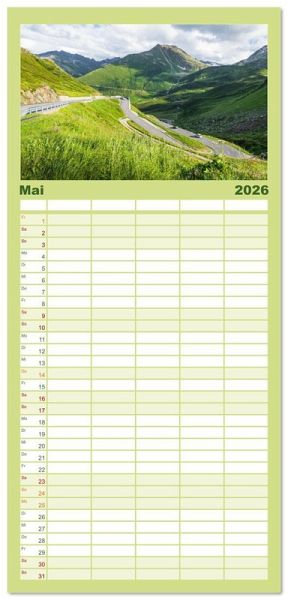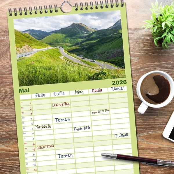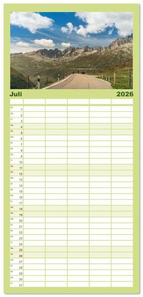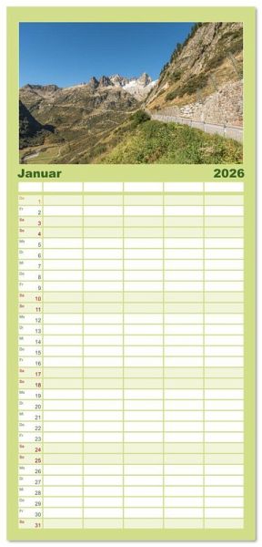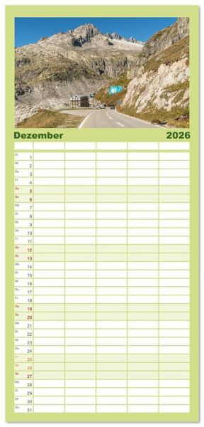 PRAKTISCH - übersichtlicher Familienkalender mit 5 Spalten für bis zu 5 Personen für mehr Struktur im Alltag - so bleiben alle Termine im Blick!ÜBERSICHTLICH - mit farblich getrennten Wochen- und Feiertagen. Die einzelnen Felder bieten genügend Platz für Eintragungen. So macht Organisieren Spaß!FANTASTISCHE BILDER - Dieser Planer ist nicht nur eine nützliche Hilfe im Alltag, sondern schmückt gleichzeitig Ihr Zuhause. Ideal auch als Geschenk.FÜR ALLE STIFTE GEEIGNET - ganz egal, ob Sie lieber mit Kugelschreiber oder Bleistift schreiben.NACHHALTIG - deutliche Abfallreduzierung durch bedarfsgerechte Einzelstückfertigung, umweltfreundliches FSC-zertifiziertes Papier, Produktion in Deutschland, klimabewusste Logistik.Eine Reise über sechs Gebirgspässe durch 5 Kantone der Schweiz. Grimselpass, Furkapass, Sustenpass, Gotthardpass, Oberalppass und Klausenpass von Autor(in): Conny Pokorny