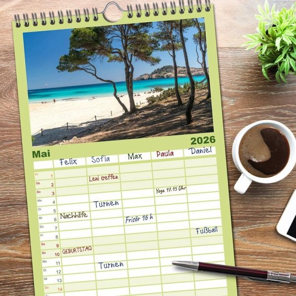 PRAKTISCH - übersichtlicher Familienkalender mit 5 Spalten für bis zu 5 Personen für mehr Struktur im Alltag - so bleiben alle Termine im Blick!ÜBERSICHTLICH - mit farblich getrennten Wochen- und Feiertagen. Die einzelnen Felder bieten genügend Platz für Eintragungen. So macht Organisieren Spaß!FANTASTISCHE BILDER - Dieser Planer ist nicht nur eine nützliche Hilfe im Alltag, sondern schmückt gleichzeitig Ihr Zuhause. Ideal auch als Geschenk.FÜR ALLE STIFTE GEEIGNET - ganz egal, ob Sie lieber mit Kugelschreiber oder Bleistift schreiben.NACHHALTIG - deutliche Abfallreduzierung durch bedarfsgerechte Einzelstückfertigung, umweltfreundliches FSC-zertifiziertes Papier, Produktion in Deutschland, klimabewusste Logistik.Eine wunderbare Reise durch einige der schönsten Orte der beliebten Baleareninsel. von Autor(in): Peter Schickert