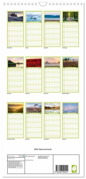 PRAKTISCH - übersichtlicher Familienkalender mit 5 Spalten für bis zu 5 Personen für mehr Struktur im Alltag - so bleiben alle Termine im Blick!ÜBERSICHTLICH - mit farblich getrennten Wochen- und Feiertagen. Die einzelnen Felder bieten genügend Platz für Eintragungen. So macht Organisieren Spaß!FANTASTISCHE BILDER - Dieser Planer ist nicht nur eine nützliche Hilfe im Alltag, sondern schmückt gleichzeitig Ihr Zuhause. Ideal auch als Geschenk.FÜR ALLE STIFTE GEEIGNET - ganz egal, ob Sie lieber mit Kugelschreiber oder Bleistift schreiben.NACHHALTIG - deutliche Abfallreduzierung durch bedarfsgerechte Einzelstückfertigung, umweltfreundliches FSC-zertifiziertes Papier, Produktion in Deutschland, klimabewusste Logistik.Stille Momente in der Natur genießen von Autor(in): Moqui