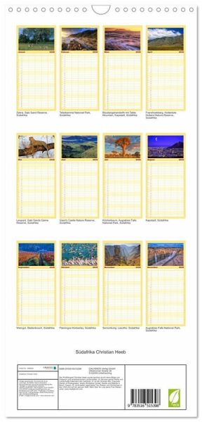 PRAKTISCH - übersichtlicher Familienkalender mit 5 Spalten für bis zu 5 Personen für mehr Struktur im Alltag - so bleiben alle Termine im Blick!ÜBERSICHTLICH - mit farblich getrennten Wochen- und Feiertagen. Die einzelnen Felder bieten genügend Platz für Eintragungen. So macht Organisieren Spaß!FANTASTISCHE BILDER - Dieser Planer ist nicht nur eine nützliche Hilfe im Alltag, sondern schmückt gleichzeitig Ihr Zuhause. Ideal auch als Geschenk.FÜR ALLE STIFTE GEEIGNET - ganz egal, ob Sie lieber mit Kugelschreiber oder Bleistift schreiben.NACHHALTIG - deutliche Abfallreduzierung durch bedarfsgerechte Einzelstückfertigung, umweltfreundliches FSC-zertifiziertes Papier, Produktion in Deutschland, klimabewusste Logistik.Landschaften und Tiere Südafrikas von Autor(in): Christian Heeb